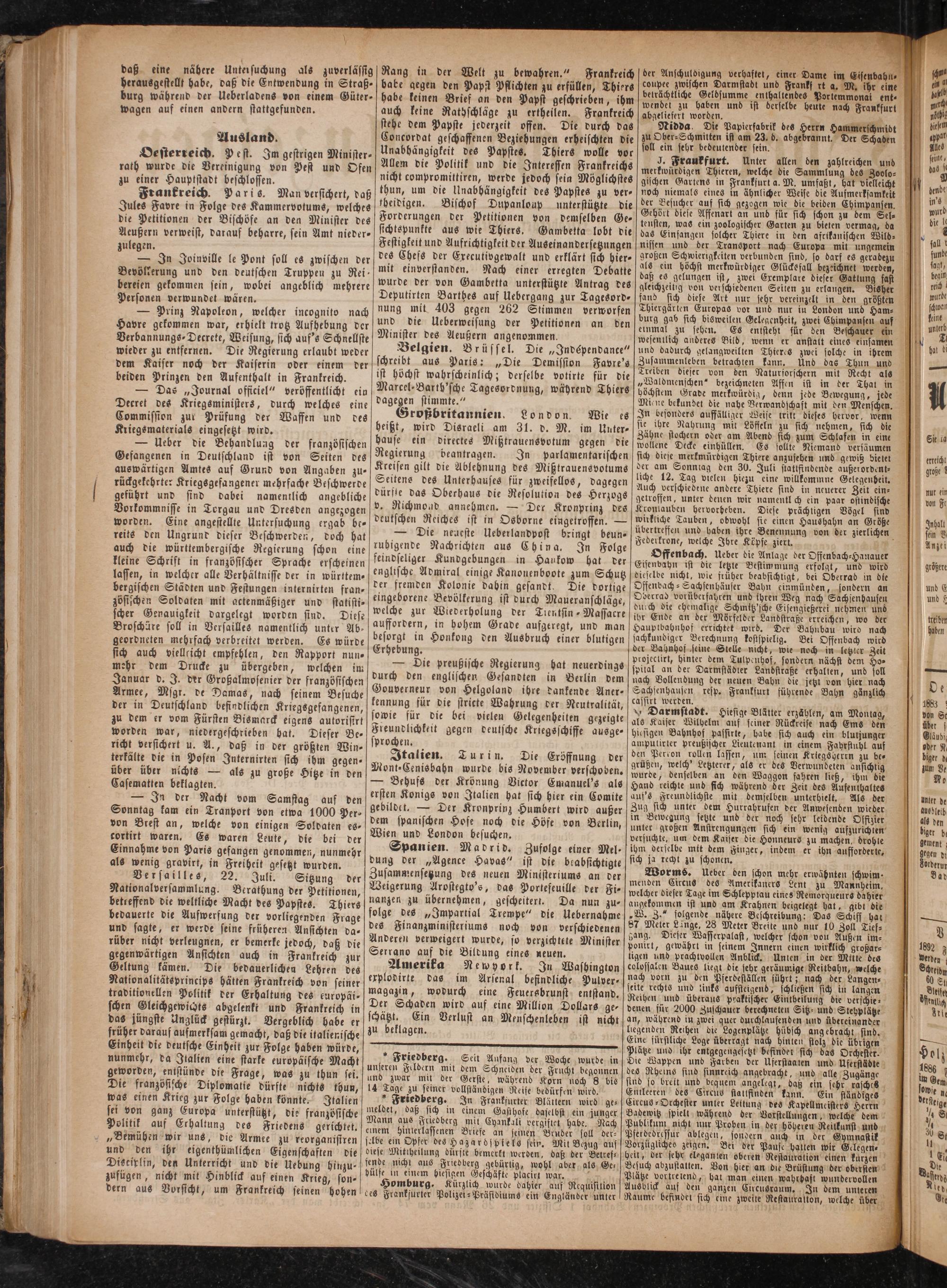 Versailles, 22. Juli. Sitzung der Nationalversammlung. Berathung der Petitionen, betteffend die weltliche Macht des Papstes. Thiers bedauerte die Auswerfung der vorliegenden Frage und sagte, er werde seine früheren Ansichten da⸗ rüber nicht verleugnen, er bemerke jedoch, daß die gegenwärtigen Ansichten auch in Frankreich zur Geltung kämen. Die bedauerlichen Lehren des Nationalitätsprincips hätten Frankreich von seiner traditionellen Politik der Erhaltung des europäi⸗ schen Gleichgewichts abgelenkt und Frankreich in das jüngste Unglück gestürzt. Vergeblich habe er früher darauf aufmerksam gemacht, daß die italienische Einheit die deutsche Einheit zur Folge haben würde, nunmehr, da Italien eine starke europäische Macht geworden, entstünde die Frage, was zu thun sei. Die französische Diplomatie dürfte nichts thun, was einen Krieg zur Folge haben könnte. Italien sei von ganz Europa unterstützt, die französische Politik auf Erhaltung des Friedens gerichtet. „Bemühen wir uns, die Armee zu reorganistren und den ihr eigenthümlichen Eigenschaften die Dis cirlin, den Unterricht und die Uebung hinzu- zufügen, nicht mit Hinblick auf einen Krieg, son⸗ dern aus Vorsicht, um Frankreich seinen hohen