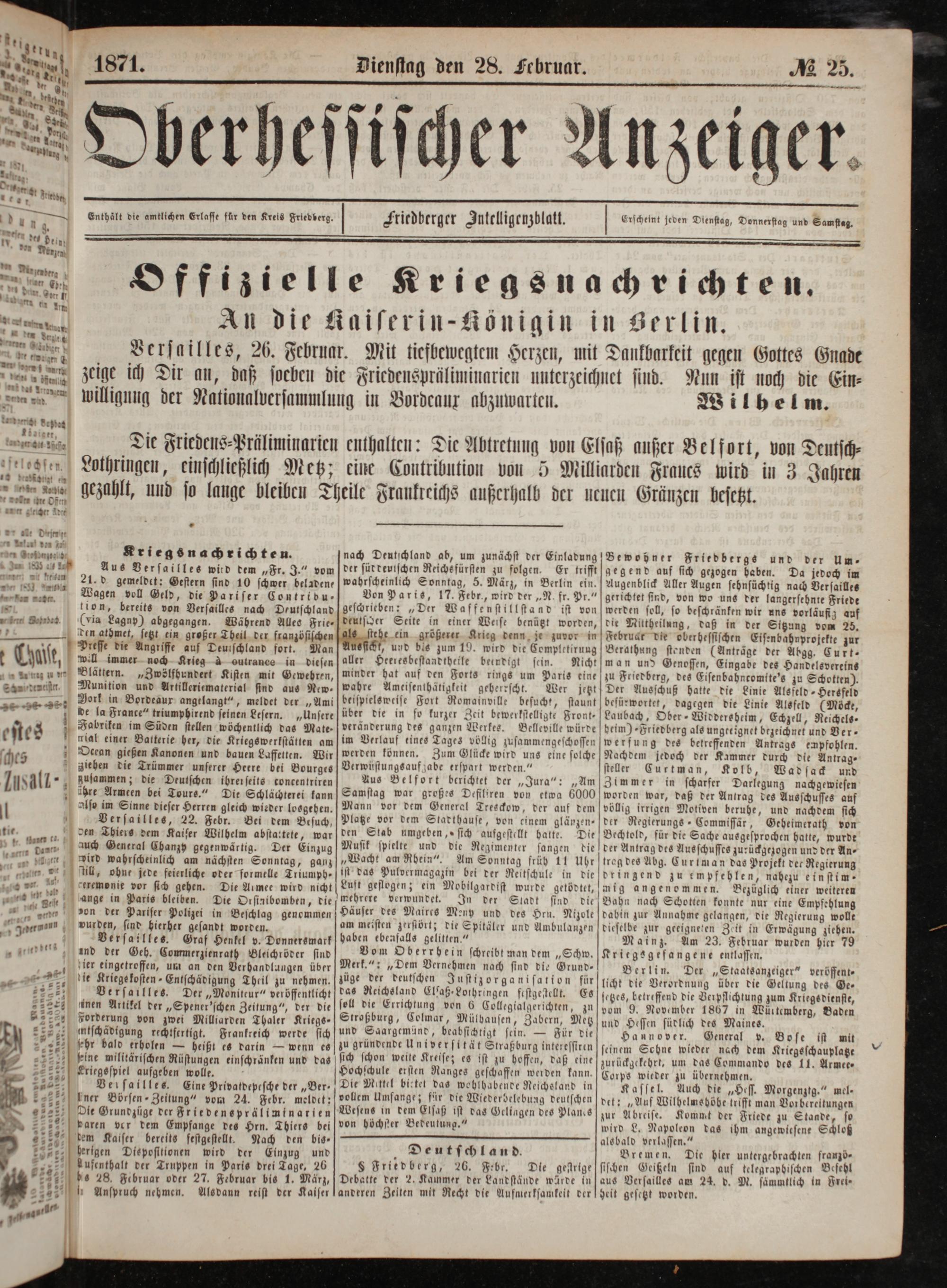 An die Kaiserin-Königin in Serlin. Versgilles, 26. Februar. Mit tiefbewegtem Herzen, mit Dankbarkeit gegen Gottes Gnade zeige ich Dir au, daß socben die Friedenspräliminarien unterzeichnet sind. Nun ist noch die Ein⸗ willigung der Nationalversammlung in Bordeaux abzuwarten.