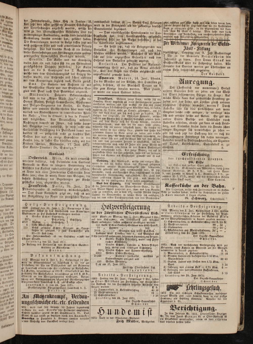Mülhausen. Folgende Bekanntmachung liest man in der„Neuen Mülh. Ztg.“:„An die Herren Maires, Polizei⸗Commissarien, Gendarmen und Polizei-Sergeanten des Kreises. An Bahn— höfen und anderen Verkehrsstellen hört man noch vielfach von Kinderschaaren in demonstrativer Weise die Rufe:„Vive la France, à bas la Prusse“, und dergleichen. Aus Veranlassung mehrerer Nachfragen bemerke ich Ihnen, daß solche harm— lose Vorgänge— natürlich, so weit nicht eine thatsächliche Belästigung des Publikums damit ver— bunden ist— polizeilich nicht zu beachten sind. Sollten hier und da einige Erwachsene in den Haufen sein, so lassen Sie dieselben ruhig mit den Kindern schreien, Mülhausen, 17. Juni 1871. Der Kreis Director: Dr. Schulze.“