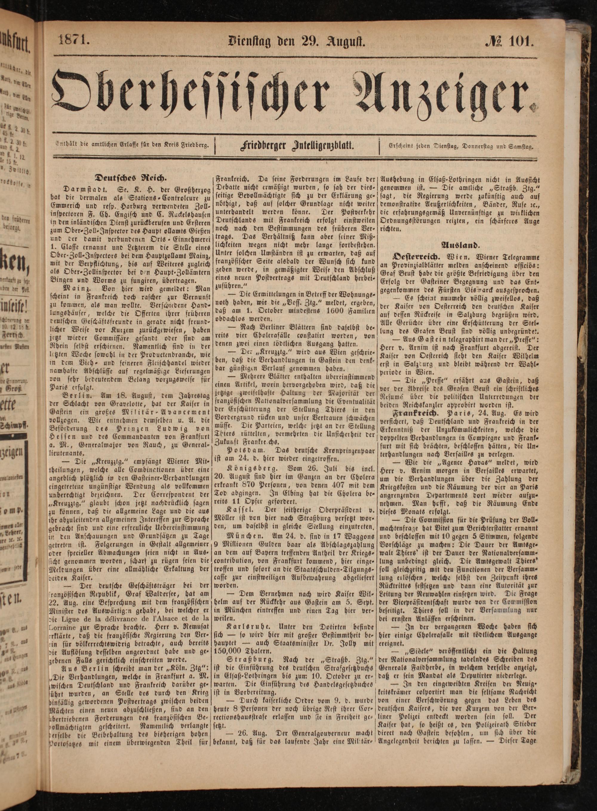 Oesterreich. Wien. Wiener Telegramme an Provinzialblätter melden anscheinend officiös: Graf Beust habe die größte Befriedigung über den Erfolg der Gasteiner Begegnung und das Ent— gegenkommen des Fürsten Bismarck ausgesprochen.