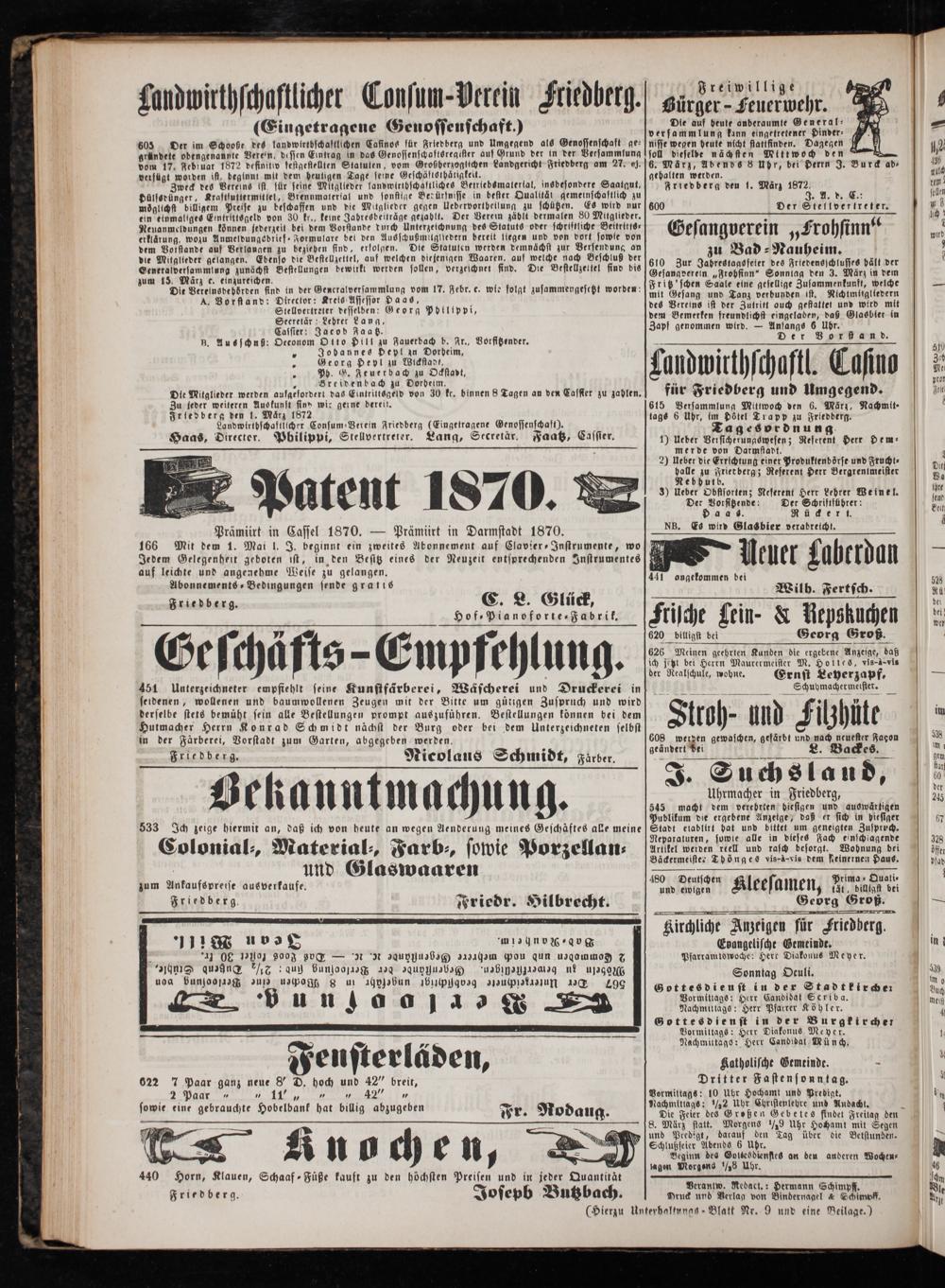 605 Oer im Schooße des landwirtbschaftlichen Cafinos für Friedberg und Umgegend als Genossenschaft ge⸗ gründete obengenannte Verein, dessen Eintrag in das Genossenschaftsregister auf Grund der in der Versammlung vom 17. Februar 1872 definitiv festgeftellten Statuten, vom Großherzoglichen Landgericht Friedberg am 27. ej. veisügt worden ist, deginnt mit dem heutigen Tage seine Geschäftothaͤtigkeit.