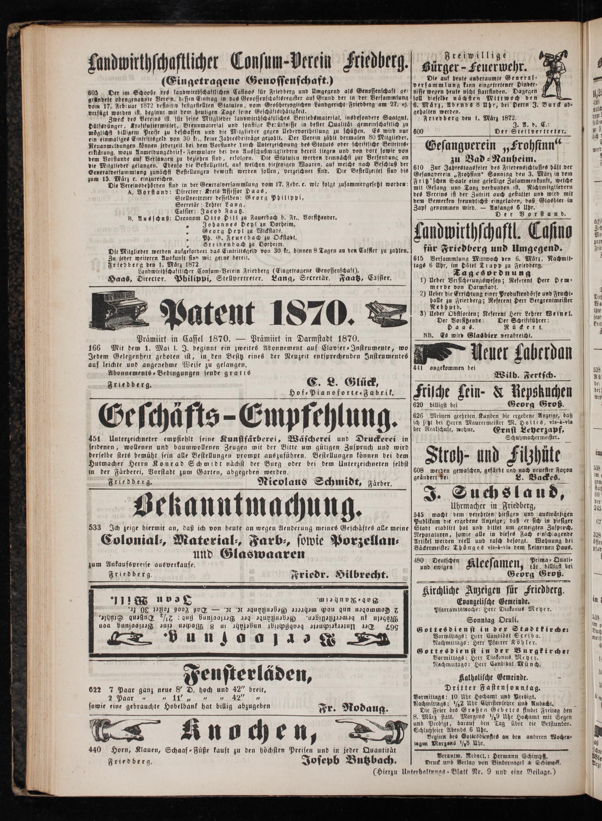 Landwirthschaftlicher Consum⸗Verein Friedberg(Eingetragene Genossenschaft). Haas, Directer. Philippi, Stellvertreter. Lang, Secretär. Faatz, Cassser.