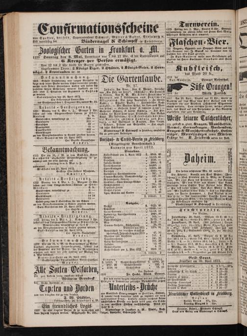 Wilb. Fertsch. Nele 1217 Am 28. April. Abends vor 10 Ubr, wurde zu Die 0 Nauheim auf dem Wege vom pölel Kursaal nach dem Bahnbose ein aus Reis strob geflochtenes Eigarren⸗ guts etuis verloren. Dem redltchen Finder, welcher gebeten ae wird, das Etuis auf dem Poltzetamte zu Bad⸗Nauheim 1 Exemp abzultefern, eine gute Belohnung. daß von Weiße leinene Taschentücher, g 1 113 gestickt u. glatt, Kragen, Manschetten, Aermel, Herrenkragen, Vorhemden. K ragen ·& Manschettenkn öpfe, Hosen⸗ träger, Moiréscpürzen sowie Myrten-⸗ kränze bei K. Friedrich neben der Post. 85 25 Da 88 1 8 dungsbe 8 7 5 Ill. 2. aheim. „ 2 gemi g. 8 5 a 2 Faisetlich 88 S ii e Sie soeben erschlenene Nr. 31 enthäft: 23 1 beni Die Arbeiter. Novelle von Einf Wichert.(Fort- 6 dun setzung.)— Das Erddeben am 6. März in Deutsch⸗ ae land. Mit einer Karte des Erdbebens.— Aus Rudens 0 19 Lehr jahren. M't dem Bilde von Steder: Van Noord 0 1 überrascht seinen Schüler Paul Rubens beim Malen. 10 ei — Ein best derter Fischer. Von Karl Müller in Als ligt jelb. Mit JAustratten von Dahl.— Aus den Schreckens dd due tagen der Pariser Commune. I. Das Blutdad in der ae d Rue Hexo.— Am Lamilientische: Deutsche Flotte aus lu mit deutschem Holz und Eisen.— Ein deutscher Mann im Elsaß. 1 nä Zu Befsellungen empfehlen sich b ö idee rg Binder nagel& Schimpff in Friedberg. ö 1 0 2. einen 0 F ruchtpreise. lee Per Malter. e Friedberg, 30. April. Walzen 15 fl. 45 lr. den Kor 9 fl. 45 br.: Gerste 7 fl. 30 kr.; Hafer 5 fl. 10 kt. Aprächende Frankfurt, 29. April.(200 Zollpfund.) Waizen det Jäser 16½— ½; Kor! 11—1½ß; Gerste 9½ /; Hafer Ain Händen 8 8½; Nübzl(100 Zollpfund) ohne Faß von emptlun 50 Ctr. 24½ fl.; Branniwein(50% Tr. per 160 Lit.) die 3 ohne Faß—. ius Wan Grünberg, 27. April. Waizen 15 fl. 56 kr. meißt Korf 10 fl. 54 kr.; Gerste 7 fl. 40 kr.; Hafer 4 fl. 26 kr. gt en Molter— fl.— kr.; Erbsen 10 fl. 54 kr.; Linsen— fl. Unchun — kr.; Saamen 19 fl. 20 kr.; Kartoffeln 4 fl. 29 fr. H ichun g Mo inz, 26. Apt. Walzen 16 fl. 20 fr.; Kern lach 10 fl. 51 lc.; Gerste— fl.— kr.; Hafer 9 fl. 20 kr. fe d Kartoffeln 5 fl.— kr.; Reggenstrol per 100 Gebund 24 fl. f daa 5. — 5— a 1 Geld Cours. 0 0 Franklurt am 30. April 1872. e a c Preußische Friedrichsd“ot...„ fl. 9 57½ 58 ½ hen Pistolen„„,„„en,„ eee ee dun Holländische fl. 10, Stücke„ 3.835 1 Ducgten F„ 5 33-35 0 Ducaten al marco.„ 5 34-36. 20⸗ Fraukenstücke e 0 d Englische Sovereigns.„ 11 48—50 i un Russische Imperiales„ 9 40—42 Wo Dollars in Gold ne eee N 5 1 uche 0 42 2—* N Israclitischer Gottesdienst in Friedberg. e 1 Beginn 5 Im ade Freitag Abends 65% Uhr.. Nan Samstag Morgens 8 Uhr. ö. Verantw. gtedact.: Permann Schimpff. 0 unt Druck und Verlag von Bindernagel& Schimpf. back N Ut