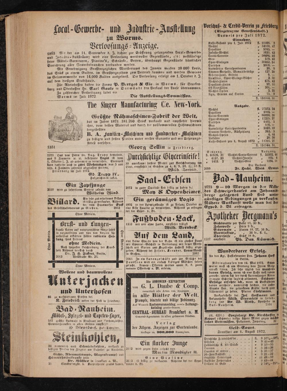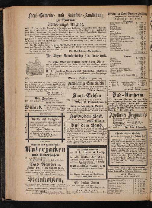 Friedberg im Juli 1872. Ed. Trapp IV., Ei 5 22 in Japfjunge 2030 wird zu sofortigem Eintritt gesucht von Wilhelm Wind. 2 Ein sehr gut erbaltenes Billard Billard. ift billig zu verkaufen. Näheres bei dem Haus meiger Sack 2 Obne Mediein. 1 Brust- und Lungen- in verzweifelten und von den Aerzten für unbeilbar erklärten Fällen radicale Hei⸗ lung ihres Leidens Nach spezieller Beschreibung der Krank⸗ heit Näheres brieflich durch 915 Dir. J. H. Fickert, Berlin,