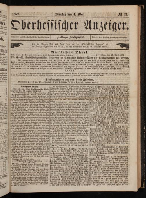 Für die Monate Mai und Juni kann auf den„Oberhessischen. Anzeiger“ bei der Verlags-Expedition mit 20 kr., bei den Poststellen mit 32 kr. abonnirt werden.