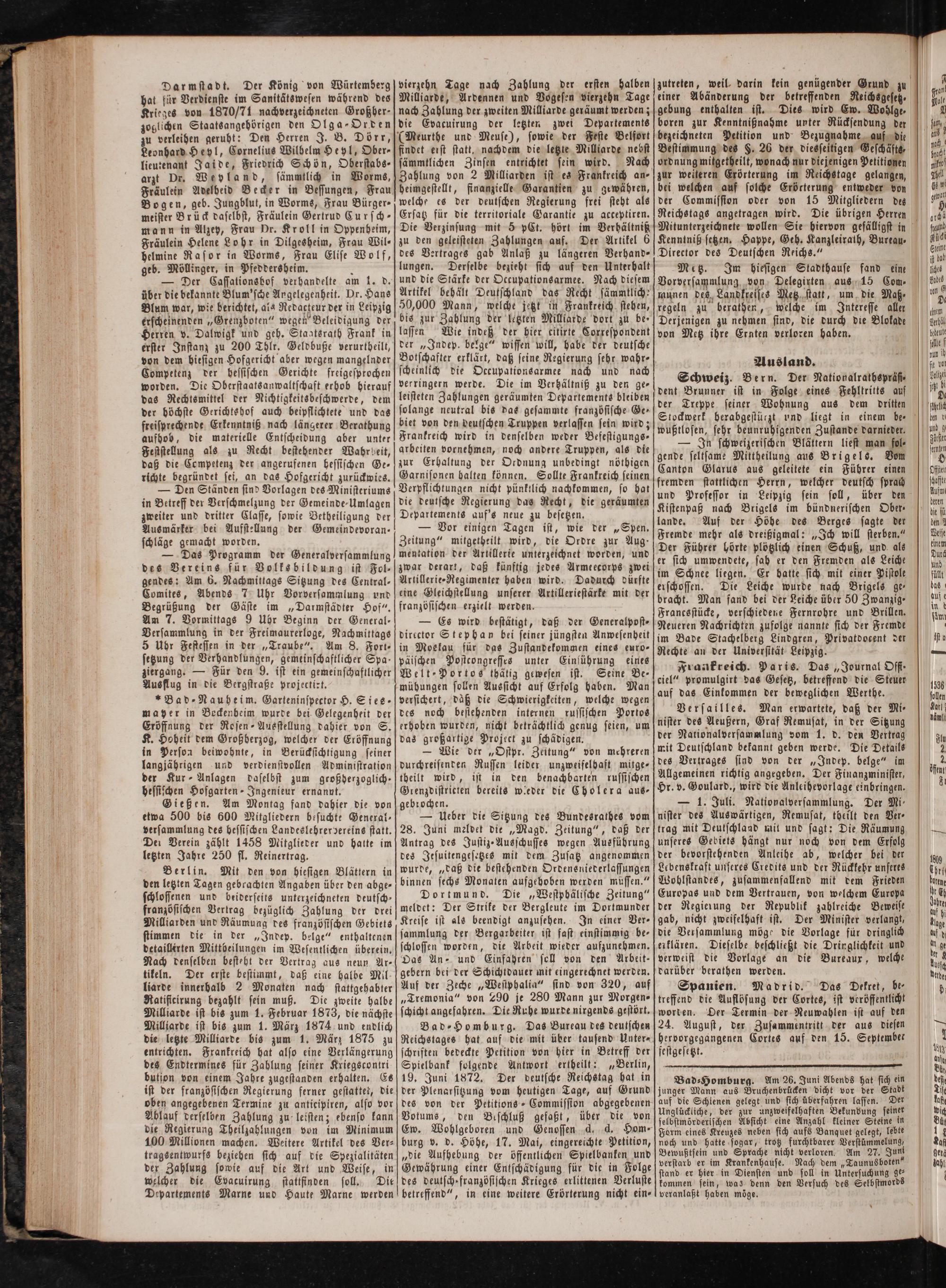 Bad⸗ Homburg. Das Bureau des deutschen Reichstages hat auf die mit über tausend Unter⸗ schriften bedeckte Petition von hier in Betreff der Spielbank folgende Antwort ertheilt:„Berlin, 19. Juni 1872. Der deutsche Reichstag hat in der Plenarsitzung vom heutigen Tage, auf Grund des von der Petitions-Commission abgegebenen Votums, den Beschluß gefaßt, über die von Ew. Wohlgeboren und Genossen d. d. Hom⸗ burg v. d. Höhe, 17. Mai, eingereichte Petition, „die Aufhebung der öffentlichen Spielbanken und Gewährung einer Entschädigung für die in Folge des deutsch⸗französischen Krieges erlittenen Verluste betreffend“, in eine weitere Erörterung nicht ein-