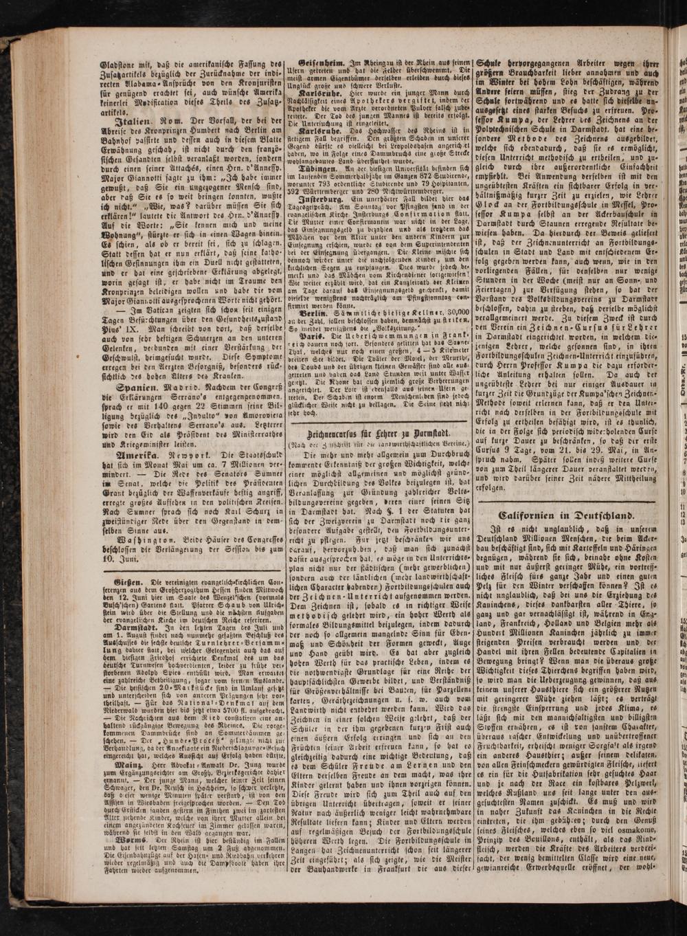 Amerika. Newyork. Die Staatsschuld hat sich im Monat Mai um ca. 7 Millionen ver- mindert.— Die Rede des Senators Sumner im Senat, welche die Politik des Präsidenten Grant bezüglich der Waffenverkäufe beftig angriff, erregte großts Aufsehen in den politischen Kreisen. Nach Sumner sprach sich noch Kail Schurz in zweistündiger Rede über den Gegenstand in dem- selben Sinne aus.