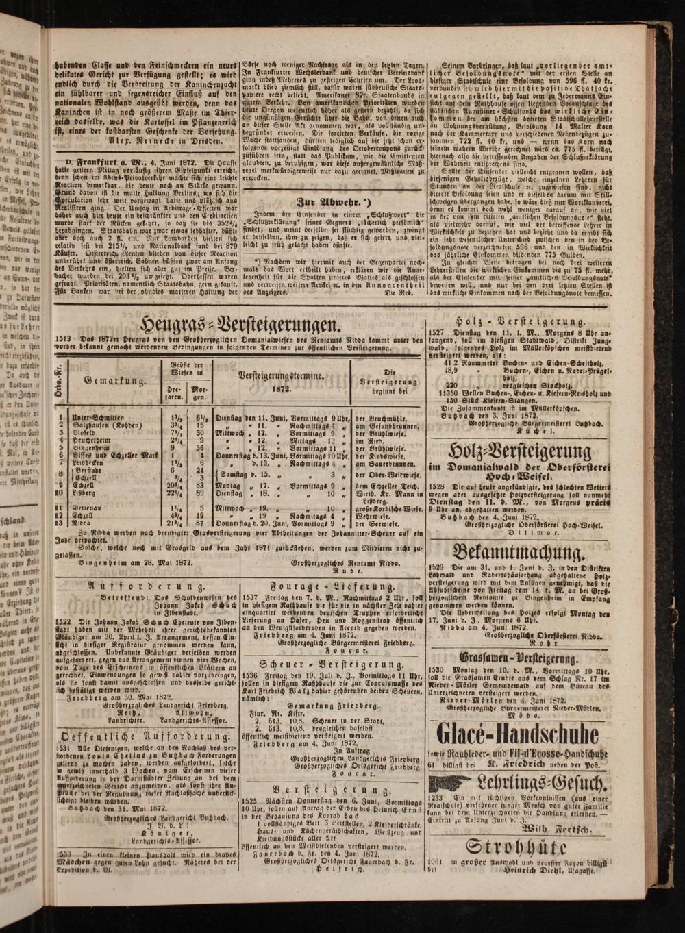 1513 Das 1872er Heugras von den Großherzoglichen Domanialwlesen des Rentamts Nidda kommt unter den vorher bekannt gemacht werdenden Bedingungen in folgenden Terminen zur öffentlichen Versieigerung.