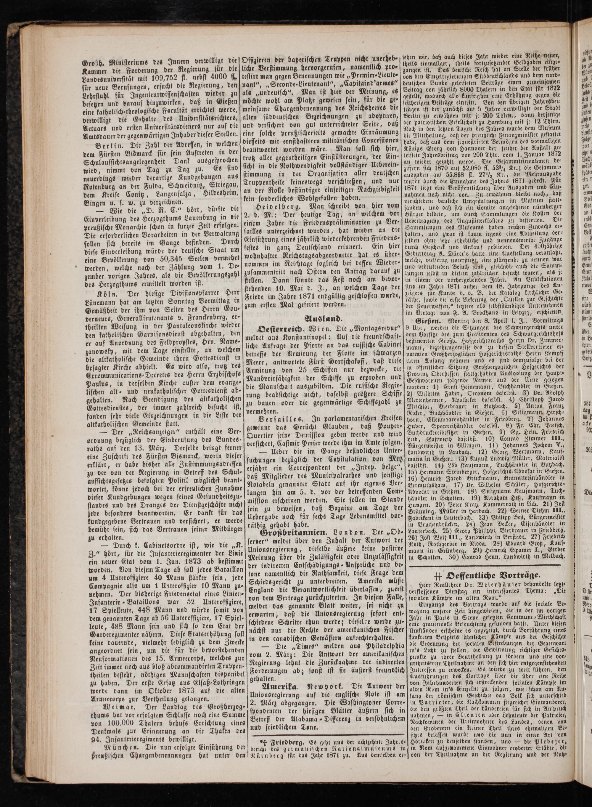 Gießen. Montag den 8. April l. J., Vormittags 9 Uhr, werden die Sitzungen des Schwurgerichts unter dem Vorsitze des zum Präsidenten des Schwurgerichtshofs bestimmten Großh. Hofgerichtsraths Herrn Dr. Zimmer⸗ mann, beziehungsweise des zu dessen Stellvertreter er⸗ nannten Großherzoglichen Hofgerichtsraths Herrn Kempff ihren Anfang nehmen und es sind demzufolge bei der in öffentlicher Sitzung Großherzoglichen Hofgerichts der Provinz Oberhessen staltgehabten Ausloosung der Haupk⸗ Geschworenen folgende Namen aus der Urne gezogen worden: 1) Ernst Heinemann, Buchhändler in Gießen. 2) Wilhelm Faber, Oeconom daselbst. 3) Dr. Adolph Mettenheimer, Apotheker daselbst. 4) Christoph Jacob Melchior, Bierbrauer in Butzbach. 5) Anton Franz Ricker, Buchhändler in Gießen. 6) Seligmann Hirsch⸗ horn, Ellenwaarenhändler in Friedberg. 7) Johannes Huber, Specereihändler daselbst. 8) Fr. Chr. Pietsch, Buchdruckereibesitzer in Gießen. 9) Gg. Hein. Friedrich Leib, Gastwirth daselbst. 10) Conrad Zimmer III., Bürgermeister in Villingen. 11) Johannes Jochem J., Landwirth in Laubach. 12) Georg Wortmann, Kauf⸗ mann in Gießen. 13) August Ludwig Müller, Materialist daselbst. 14) Löb Kaufmann, Tuchhändler in Butzbach. 15) Hermann Steinberger, Hofgerichts-Advokat in Gießen. 16) Heinrich Jacob Brückmaun, Branntweinhändler in Bermuthshain. 17) Dr. Wilhelm Schüler, Hofgerichts⸗ Advocat in Gießen. 18) Seligmann Kaufmann, Tuch⸗ händler in Schotten. 19) Abraham Heß, Kaufmann in Hungen. 20) Peier Kratz, Kammerrath in Lich. 21) Jost Bräuning, Müller in Harbach. 22) Werner Diehm III., Fabrikant in Lauterbach. 23) Philipp Best, Bürgermeister in Bruchenbrücken. 24) Jean Becker, Eisenhändler in Lauterbach. 25) Georg Philippi, Bierbrauer in Friedberg. 26) Jost Wolf III., Landwirih in Berstadt. 27) Friedrich Roth, Rothgerber in Nidda. 28) Eduard Groß, Kauf⸗ mann in Grünberg. 29) Heinrich Spamer I., Gerber in Schotten. 30) Conrad Heun, Landwirth in Melbach.