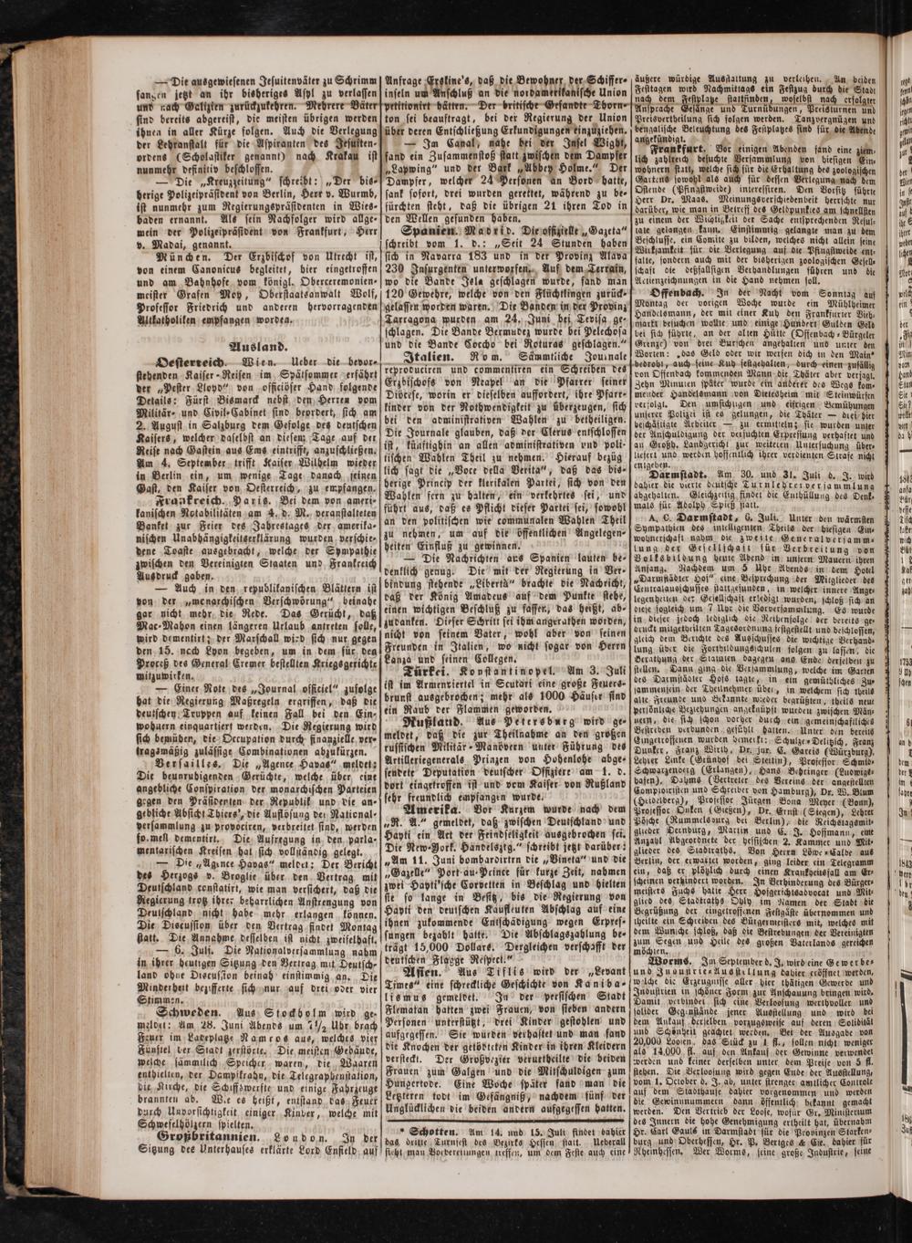 Spanien. Madrid. Die offizielle„Gazeta“ schreibt vom 1. d.:„Seit 24 Stunden haben sich in Navarra 183 und in der Provinz Alava 230 Insurgenten unterworfen. Auf dem Terrain, wo die Bande Jala geschlagen wurde, fand man 120 Gewehre, welche von den Flüchtlingen zurück⸗ gelassen worden waren. Die Banden in der Provinz Tarragona wurden am 24. Juni bei Tevisa ge⸗ schlagen. Die Bande Bermudez wurde bei Pelechosa und die Bande Coccho bei Roturas geschlagen.“