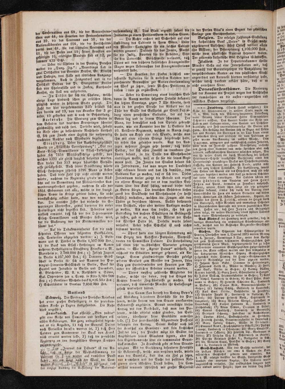 Gießen. Die Sitzungen des Schwurgerichts der Provinz Oberhessen vom 1. Quartal 1873 werden Montag den 6. Januar, Vormittags 9 Uhr, unter dem Vorsitze des zum Präsidenten bestimmien Großherzoglichen Hof⸗ gerichisraths Herrn Muth, beziehungsweise des zu dessen Stellvertreter ernannten Großherzoglichen Hofgerichtsraihs Herrn Dr. Klein eröffnet werden und sind demzufolge in der statigehabten öffentlichen Sitzung Großherzoglichen Hofgerichis dieser Provinz die Haupt ⸗Geschworenen in folgender Reihenfolge aus der Urne gezogen worden: 1) Johann Peter Bickel, Occonom in Heldenbergen; 2) Johannes Serth II., Müller in Münster; 3) Ferdi⸗ nand Burk, Müller in Gießen; 4) Ludwig Bücking Reniner daselbst; 5) Georg Fendt, Eisenhändler in Hungen 6) Jalius Wallach, Leinwandbändler in Gießen; 7) Con⸗ rad Nispel, Landwirth in Gedernz 8) Emil Pistor, Kauf⸗ mann in Gießen; 9) Heinrich Schneider II., Landwirth in Birklar; 10) Simon Reis, Branntweinhändler in Gießen; 11) Ludwig Schütz, Gastwirth in Lauterbach; 13 Karl Emil Scriba, Buchhändler in Friedberg; 13) Wilhelm Jacobi II, Landwirth in Rodheim, Kr. Vilbel; 14) Philipp Heinrich Roth, Schildwirth in Langsdorf; 15) Georg Wilhelm Wenzel, Fabrikant in Laulerbach; 16) Kaspar Hofmann II., Landwirth in Fleschenbach; 17) Adam Simon, Oeconom in Vilbel; 18) Conrad Schultheiß, Landwirth in Bernsseldz 19) Bernhard Schwarz, Fabitkant in Reichelsheim; 20) Theodor Kübel, Packtuchhändler in Herbstein; 21) Friedrich Habicht, Branniweinhändler in Lauterbach; 22) Georg Ludwig Schudt, Müller in St insurth) 23) Emanuel Reis 1, Fruchthändler in Echzell; 24) Philipp Slumpf, Landwirth in Ossenheim; 25) Georg Ewald IV., Landwirth in Ockstadt; 26) Friedrich Uhl, Bierbrauer in Nidda; 27) Wilhelm Wetz I., Schildwirth in Griedel; 28) Pbinipp Reinhard Fischer I., Rothgerber in Lich; 29) Dr. Wilbelm Stabl, Professor in Gießen; 30) Georg Keller I., Landwirth in Melbach.