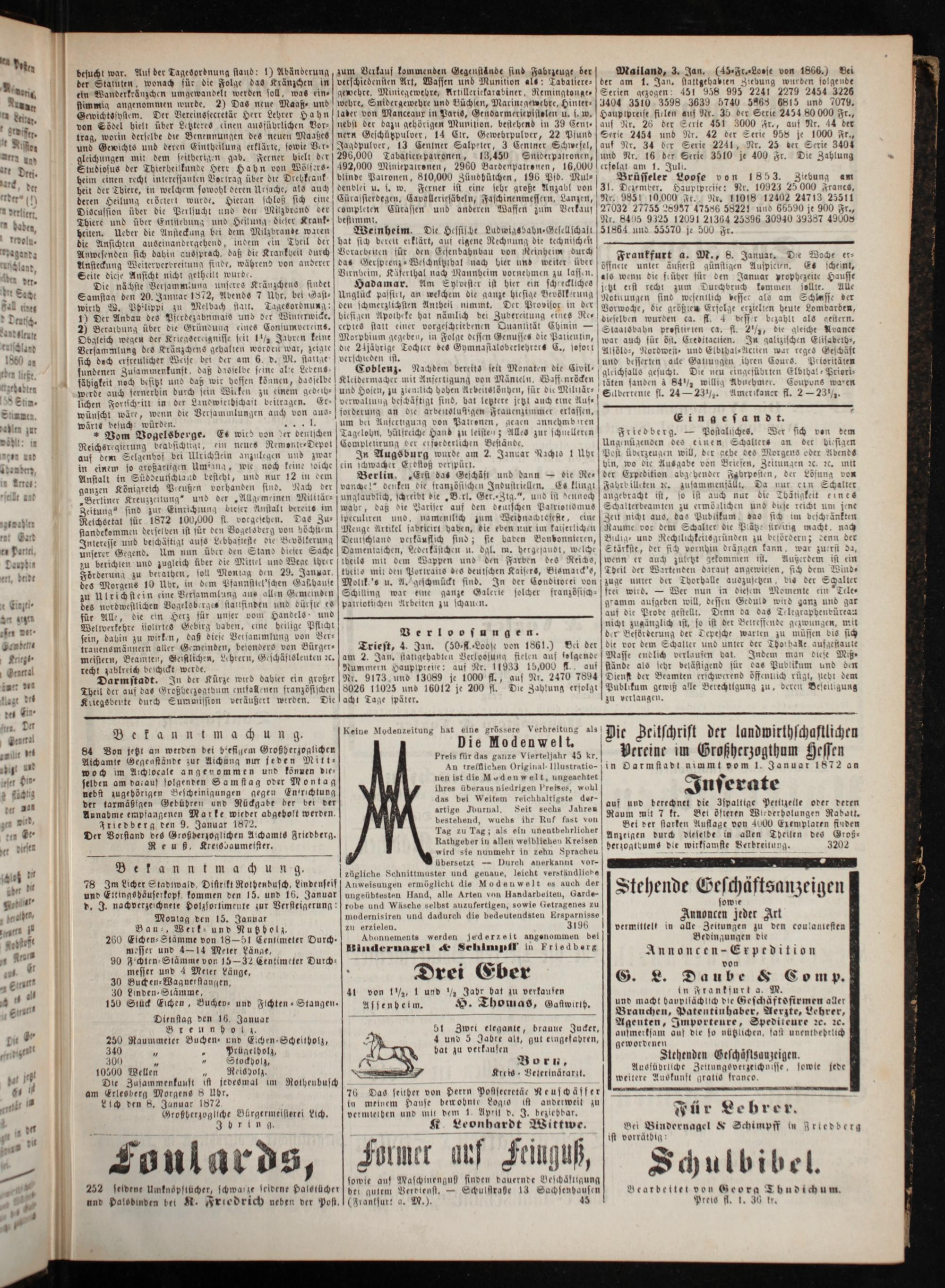 Die nächsie Versammlung unseres Kränzcheus findet Samstag den 20. Januar 1872, Abends 7 Uhr, bei Gast— wirth W. Ph'lippi zu Melbach stait. Tagesordnung: 1) Der Anbau des Pferdezabnmais und der Winterwicke. 20 Beratbung über die Gründung eines Consumverans. Obgleich wegen der Kriegserteignisse seit 1½ Jabren keine Versammlung des Kränzchens gehalten worden war, zeigte sich doch erfreulicher Weise bei der am 6. d. M. stalige fundenen Zusammenkunft, daß dasselbe seine alle Lebens