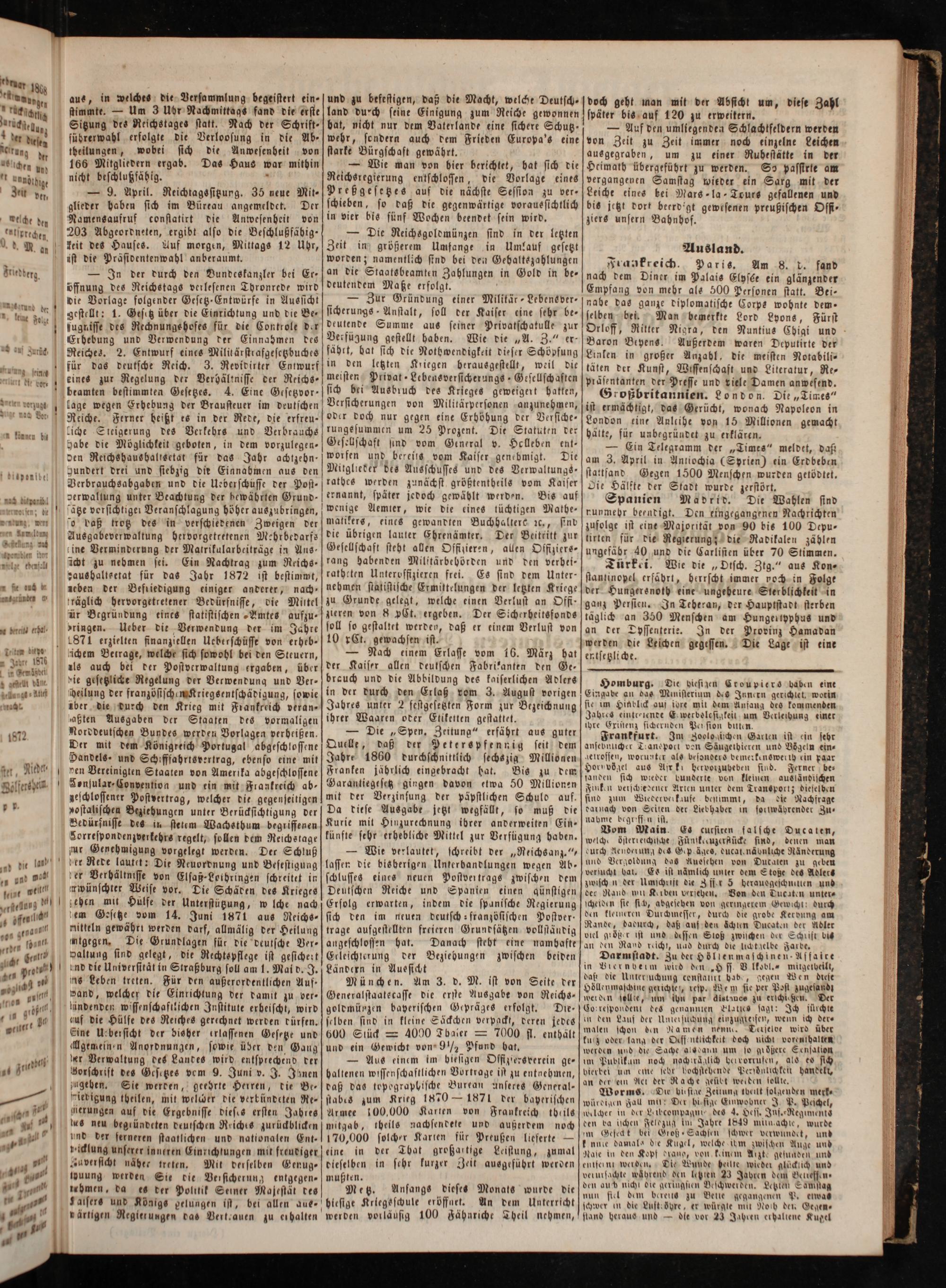 — 9. April. Reichtagssitzung. 35 neue Mit- glieder haben sich im Bürtau angemeldet. Der Namensaufruf constatirt die Anwesenheit von 203 Abgeordneten, ergibt also die Beschlußfäbig- keit des Hauses. Auf morgen, Mittags 12 Uhr, ist die Präsidentenwahl anberaumt.