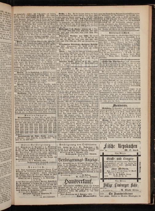 Grünberg, 9. Nobember. Die Preise auf unserem heutigen Fruchtmarkte betragen: Waizen(100 Kilo) 14 fl. 48 kr.; Korn(90 K.) 8 fl. 59 kr.; Gerste(80 K.) 7 fl. 48 kr.; Hafer(60 K.) 4 fl. 22 kr. Molter(90 K.) — fl ke.; Erbsen(110 K.) 9 fl. 43 kr.; Linsen (100 K.) 10 fl. 45 kr.; Saamen(90 K.) 15 fl. 9 kr.; Kartoffeln(100 K.) 3 fl.— kr.