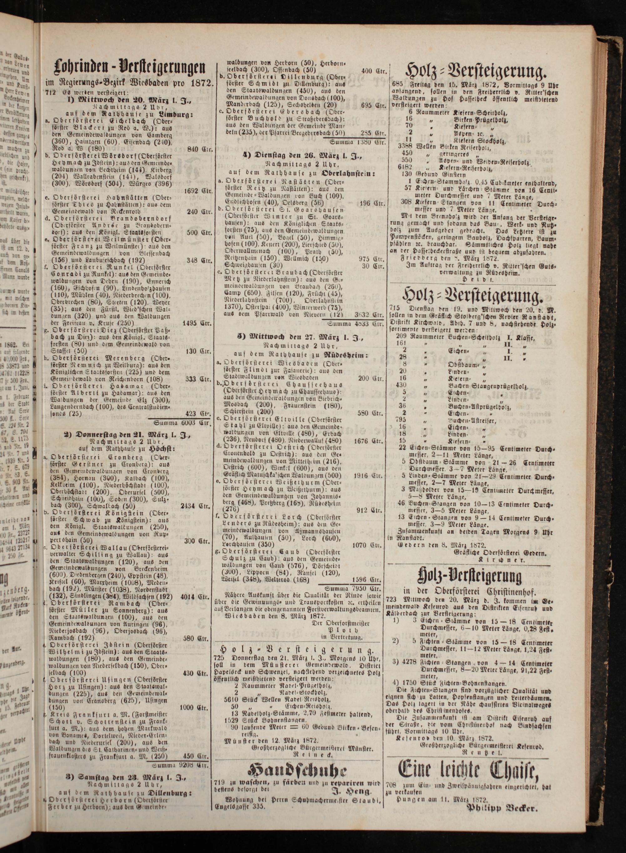 1 Holz-Versteigerung. 685 Freitag den 15. März 1872, Vormittags 9 Uhr anfangend, sollen in den Freiberrlich v. Ritter'schen Waldungen zu Hof Hasselheck oͤffentlich meistotetend