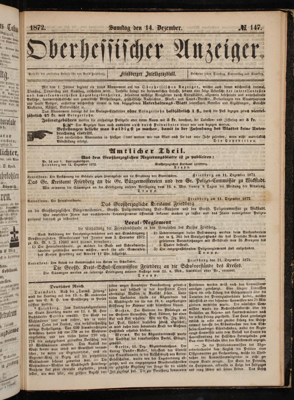 Mit dem 1. Januar beginnt ein neues Abonnement auf den Oberhessischen Anzeiger, welcher auch fern ö i i Dienstag, Donnerstag und Samstag, erscheinen wird. Derselbe bringt die n Erlasse, 5 eine Ne 11 7 60 und bemerkenswerthesten Tages begebenheiten, besonders wichtige Neuigkeiten durch Extrablätter, allgemein belehrende und unterhaltende Aufsätze, landwirthschaftliche und gewerbliche Mitiheilungen, geschäftliche Nachrichten, Markt- und Cours Berichte, Verloosungen von Staatspapieren und locale Notizen, außerdem wöchentlich einmal in dem beigegebenen Unterhaltungs⸗Blatt interessante Novellen und Erzählungen, Gedichte