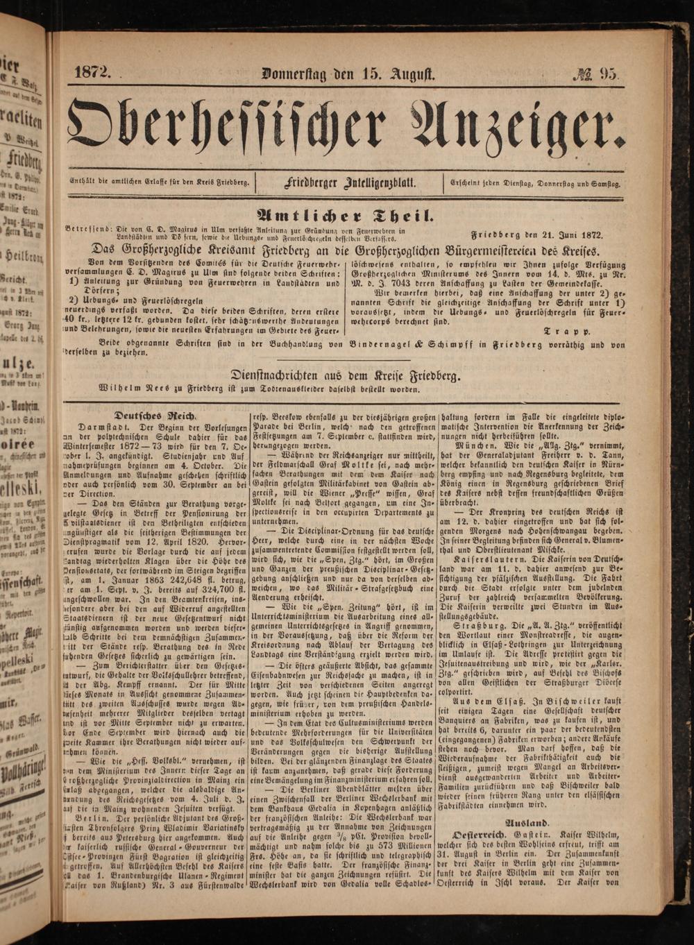 er 1872. Donnerstag den 15. August. e e 1 4 Nag N 9 05 9. * Weiz f 9 6 fr.„ Kati f 8 e Ert. 1 3 1 3 3 *. Enthält die amtlichen Erlasse für den Kreis Friedberg. Friedberger Intelligenzblatt. Erscheint jeden Dienstag, Donnerstag und Samstag. . 1873: 1 4 22 Amtlicher Theil - Au J 5 t 1 Betrefsend: Die von C. D. Magirus in Ul f Anleitung ündung ve e i a 4 ben 1 111 Lundslädten und Oö fern, 5 ee e 1 Friedberg den 21. Juni 1872. Heilbun Das Großherzogliche Kreisamt Friedberg an die Großherzoglichen Bürgermeistereien des Kreises. * 1 Von dem Vorsitzenden des Comités für die Deutsche Feuerwehr“ löschwesens enthalten, so empfehlen wir Ihnen zufolge Verfügung * versammlungen C. D. Magirus zu Ulm sind folgende beiden Schriften:[Großherzoglichen Ministerums des Innern vom 14. d. Mts. zu Nr. eticht. 1 Anleitung zur Gründung von Feuerwehren in Landstadten und M. d. J. 7043 deren Anschaffung zu Lasten der Gemeindekasse. U 0. 1 Dörfern; 8 a Wir bemerken hierbei, daß eine Anschaffung der unter 2) ge— 9 Klett D Uebungs- und Feuerlöschregeln nannten Schrift die gleichzeitige Anschaffung der Schrift unter 1)