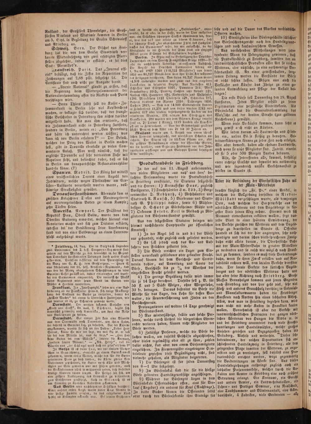 Aus vorstehenden Mittheilungen wird jeder denkende Mann die Ueberzeugung gewinnen, daß die Produktenbörse zu Friedberg, inmitten der an landwirthschaftlichen Produkten aller Art so reichen Wetterau, eine nützliche, ja eine nothwendige Ver⸗ kehrsanstalt ist. An einer gewissenhaften, sorg⸗ samen Leitung werden die Vorstände der Börse es nicht fehlen lassen. Mögen nun auch die Verkäufer und Käufer das Ihrige zu einer ge⸗ sunden Entwickelung und Pflege der Anstalt bei⸗ tragen!