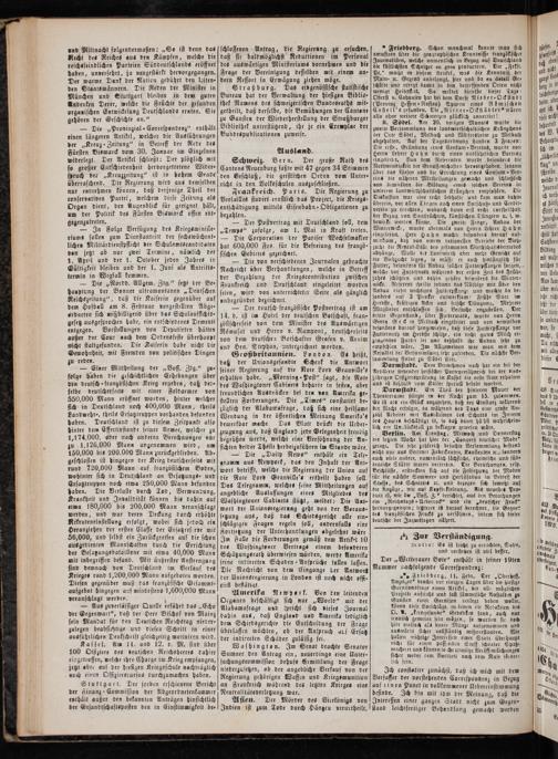 Großbritannien. London. Es heißt, daß der Unionsgesandte Schenk die Antwort seiner Regierung auf die Note Lord Granville's erhalten habe.„Morning-Post“ sagt, die Note des Washingtoner Cabinets beharre in festen, aber freundlichen Ausdrücken bei den von Amerika ge- stellten Forderungen. Die„Times“ constatirt de— züglich der Alabamafrage, daß sich eine heilsame Wendung in der öffentlichen Meinung Amtrika's bemerkbar mache. Das Blatt drückt die Ueber— zeugung aus, daß England jede Gelegenheit freudig begrüßen werde, welche eine Versöhnung der An- sichten deider Theile herbeizuführen im Stande wäre.