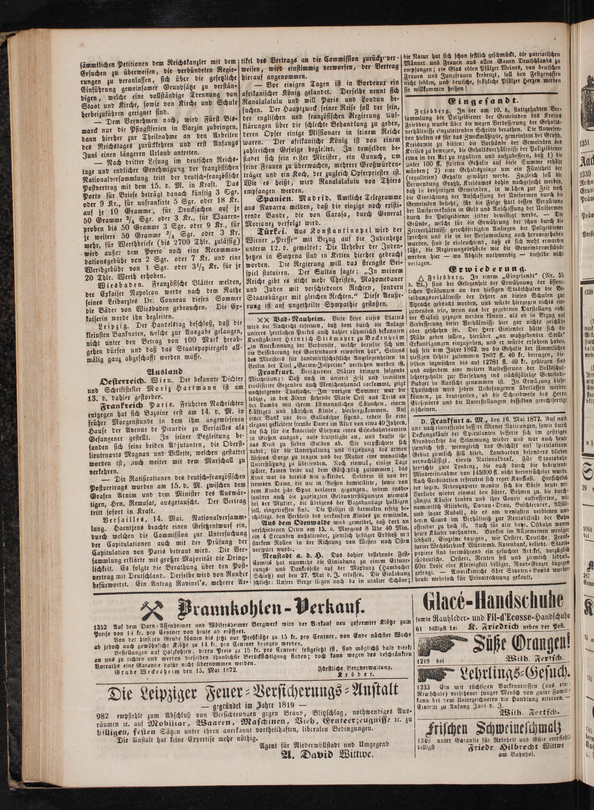 sämmtlichen Petitionen dem Reichskanzler mit dem] tikel des Vertrags an die Commission zurückzw ver Ersuchen zu überweisen, die verbündeten Regie⸗ weisen, wird einstimmig verworfen, der Vertrag rungen zu veranlassen, sich über die gesetzliche hierauf angenommen. 5 i Einführung gemeinsamer Grundsätze zu verstän⸗— Vor einigen Tagen ist in Bordeaux ein digen, welche eine vollständige Trennung von afrikanischer König gelandet. Derselbe nennt sich Staat und Kirche, sowie von Kirche und Schule Ranalalalulu und will Paris und London be⸗ herbeizuführen geeignet sind. ö suchen. Der Hauptzweck seiner Reise soll der sein, — Dem Vernehmen nach, wird Fürst Bis- der englischen und französischen Regierung Auf⸗ marck nur die Pfingstferien in Varzin zubringen, klärungen über die schlechte Behandlung zu geben, dann hierher zur Theilnahme an den Arbeiten deren Opfer einige Missionare in seinem Reiche des Reichstages zurückkehren und erst Anfangs waren. Der afrikanische König ist von einem Juni einen längeren Urlaub antreten. zahlreichen Gefolge begleitet. In demselben be⸗ — Nach dritter Lesung im deutschen Reichs findet sich sein erster Mirister, ein Eunuch, um tage und endlicher Genehmigung der französischen seine Frauen zu überwachen, mehrere Großwürden⸗ Nationalversammlung tritt der deutsch⸗französische träger und ein Koch, der zugleich Opferpriester ist. Postvertrag mit dem 15. d. M. in Kraft. Das] Wie es heißt, wird Ranalalalulu von Thiers Porto für Briefe beträgt danach künftig 3 Sgr. empfangen werden. oder 9 Kr., für unfrankirte 5 Sgr. oder 18 Kr. Spanien. Madrid. Amtliche Telegramme auf je 10 Gramme, für Drucksachen auf je aus Navarra melden, daß die einzige noch existi⸗ 50 Gramme/ Sgr. oder 3 Kr., für Waaren- rende Bande, die von Carasa, durch General proben bis 50 Gramme 3 Sgr. oder 9 Kr., für] Morionez verfolgt wird. je weitere 50 Gramme/ Sar. oder 3. Kr. Türkei. Aus Konstantinopel wird der mehr, für Werthbriefe(bis 2700 Thlr. zulässig)] Wiener„Presse“ mit Bezug auf die Judenhetze wird außer dem Porto noch eine Recomman- unterm 12. d. gemeldet: Die Urheber der Juden⸗ dationsgebühr von 2 Sgr. oder 7 Kr. und eine hetzen in Smyrna sind in Ketten hierher gebracht Werihgebühr von 1 Sgr. oder 3½ Kr. für je] worden. Die Regierung will das strengste Bei⸗ 20 Thlr. Werth erhoben. spiel statuiren. Der Sultan sagte:„In meinem Wiesbaden. Französische Blätter melden, Reiche gibt es nicht mehr Christen, Mahomedaner der Exkaiser Napoleon werde nach dem Rathes und Juden mit verschiedenen Rechten, sondern seines Ltibarztes Dr. Conneau diesen Sommer Staatsbürger mit gleichen Rechten.“ Diese Aeuße⸗ die Bäder von Wiesbaden gebrauchen. Die Ex- rung ist auf ungetheilte Sympathie gestoßen. kaiserin werde ihn begleiten. Leipzig. Der Handelstag beschloß, daß die