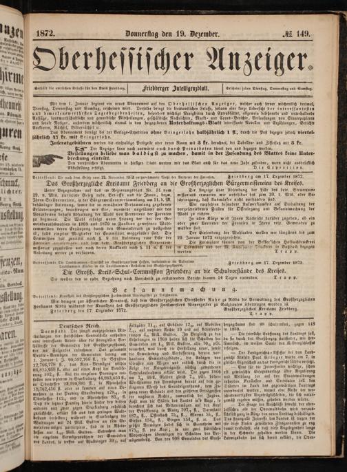 Mit dem 1. Januar beginnt ein neues Abonnement auf den Oberhessischen Anzeiger, welcher auch ferner wöchentlich dreimal,