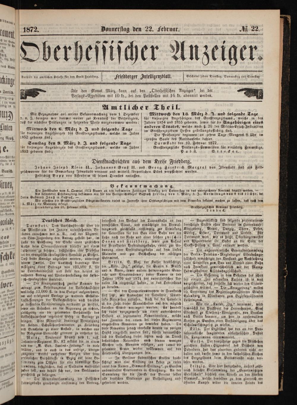 5. März die Maßnung erfolgt. Zriedderg den 21. Jebruar 1872.
