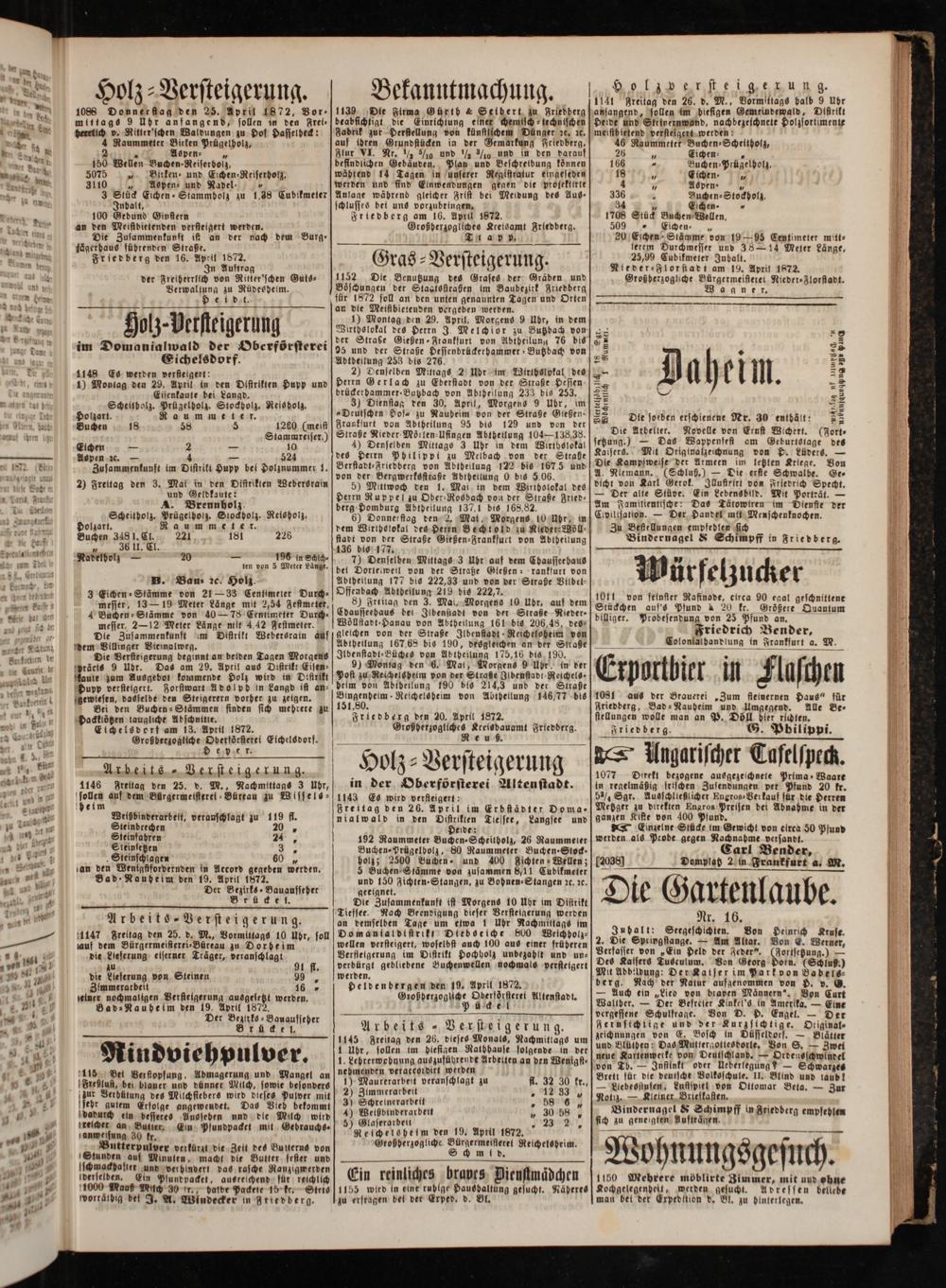 — Holz-Versteigerung. 1088 Donnecstag den 25. April 1872, Vor mittags 9 Uhr anfangend, sollen in den Frei⸗ herrlich v. Ritter'schen Waldungen zu Hof Hasselheck: