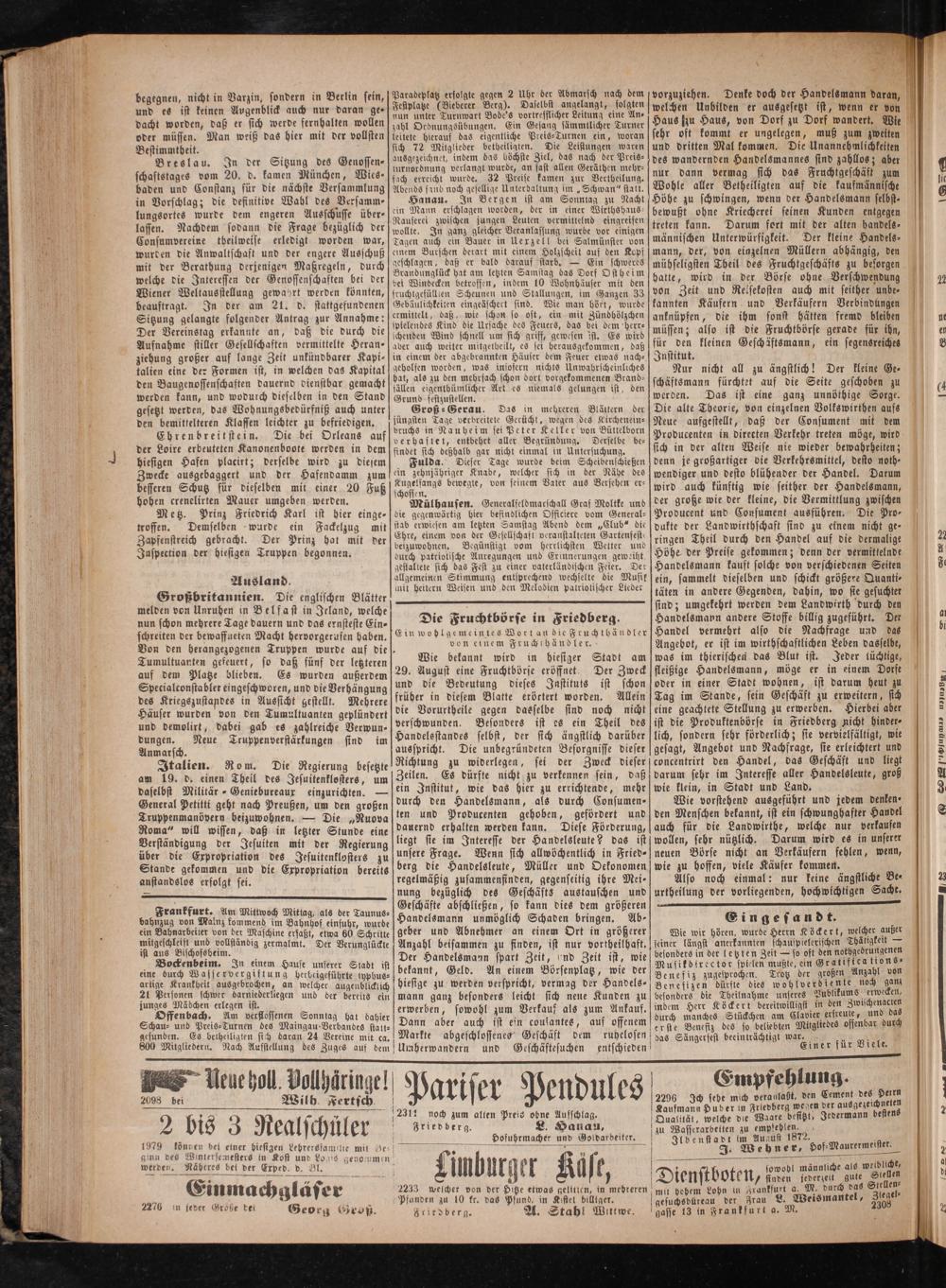 1 Empfehlung. 2296 Ich sebe mich veranlaßt, den Cement des benen Kaufmann Huber in Friedberg wegen der ausgezeichne 5 Qualttät, welche die Waare besitzt, Jedermann besten zu Wasserarbetten zu empfehlen. Ilbenstadt im August 1872.. J. Wehner, Hof⸗Maurermeister. 1 sowohl männliche als weibliche, Dienstboten, den jederzeit gute 0 mit hohem Lohn in Frankfurt a. M. durch das 15 110 gesuchsbüreau der Frau L. Weismantel, 105 gasse 13 in Frankfurt a. M.