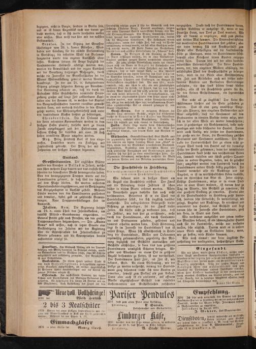 früher in diesem Blatte erörtert worden. Allein die Vorurtheile gegen dasselbe sind noch nicht verschwunden. Besonders ist es ein Theil des Handelsstandes selbst, der sich ängstlich darüber ausspricht. Die unbegründeten Besorgnisse dieser Richtung zu widerlegen, sei der Zweck dieser Zeilen. Es dürfte nicht zu verkennen sein, daß ein Institut, wie das hier zu errichtende, mehr durch den Handelsmann, als durch Consumen- ten und Producenten gehoben, gefördert und dauernd erhalten werden kann. Diese Förderung, liegt sie im Interesse der Handelsleute? das ist unsere Frage. Wenn sich allwöchentlich in Fried⸗ berg die Handelsleute, Müller und Oekonomen regelmäßig zusammenfinden, gegenseitig ihre Mei⸗ nung bezüglich des Geschäfts austauschen und Geschäfte abschließen, so kann dies dem größeren Handelsmann unmöglich Schaden bringen. Ab— geber und Abnehmer an einem Ort in größerer Anzahl beisammen zu finden, ist nur vortheilhaft. Der Handelsmann spart Zeit, und Zeit ist, wie bekannt, Geld. An einem Börsenplatz, wie der hiesige zu werden verspricht, vermag der Handels- mann ganz besonders leicht sich neue Kunden zu erwerben, sowohl zum Verkauf als zum Ankauf. Dann aber auch ist ein coulantes, auf offenem Markte abgeschlossenes Geschäft dem ruhelosen und Geschäftesuchen entschieden