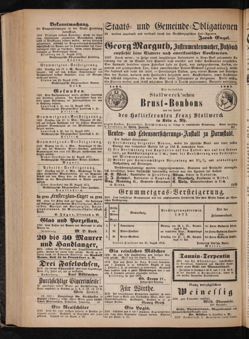 2291 Dienstag den 27. d. M., Vormittags 9 Uhr an⸗ fangend, soll auf dem hiesigen Gemeindehaus das Grummetgras hiesiger Gemeinde, eirca 150 Morgen, verfteigert werden. Staden den 22. August 1872. Großherzogliche Bürgermeisterei Staden. Dau ch. Gefunden. 2301 Eine Vorspannwaage wurde zwischen Fauerbach und Friedberg gefunden. Der Eigenthümer kann die⸗ selbe gegen Entrichtung der Inseratgebühren bei uns in Empfang nehmen. Fauerbach b. Fr. den 22. August 1872. Großherzogliche Bürgermeisteret Fauerbach b. Fr. Helfrich.