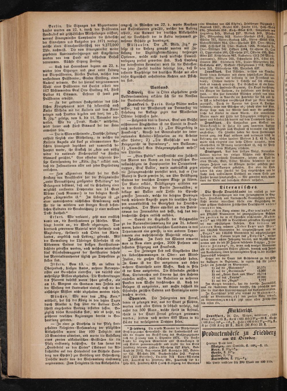 Productenbörse zu Friedberg am 22. October. i eis l N 50 Qualität, fl. 14¼—fl. 15. Koi n, fl. 9½—/ 8. 1 er, fl. 7½. Laltoshein, fl. 2785. i 5 Alle Preise verstehen sih 200 Pfund 100 Kilo.