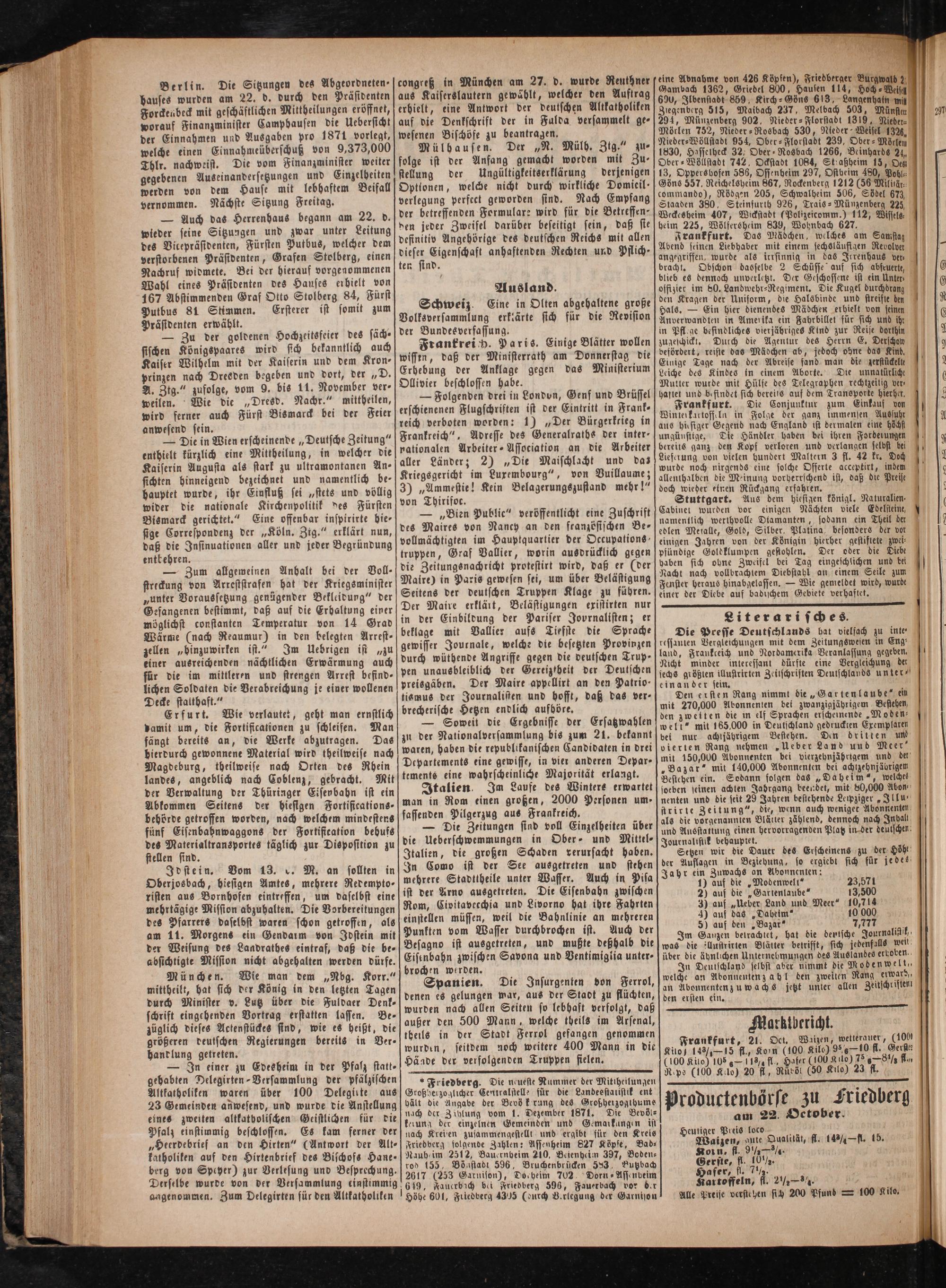 »Friedberg. Die neueste Nummer der Mittheilungen Großherzoglicher Centralstelle für die Landesstalistik ent hält die Angabe der Bevö kerung des Großherzogthume nach der Zihlung vom 1. Dezember 1871. Die Bevöl⸗ kerung der einzelnen Gemeinden und Gemarkungen ist nach Kreisen zusammengestellt und ergibt für den Kreis Friedverg folgende Zahlen: Assenheim 827 Köpfe, Bad⸗ Nauheim 2512, Bauernheim 210, Beienheim 397, Boden⸗ rod 155, Böastadt 596, Bruchenbrücken 583, Butzbach 2617(253 Garnison), Docheim 702 Dorn ⸗Assenbeim