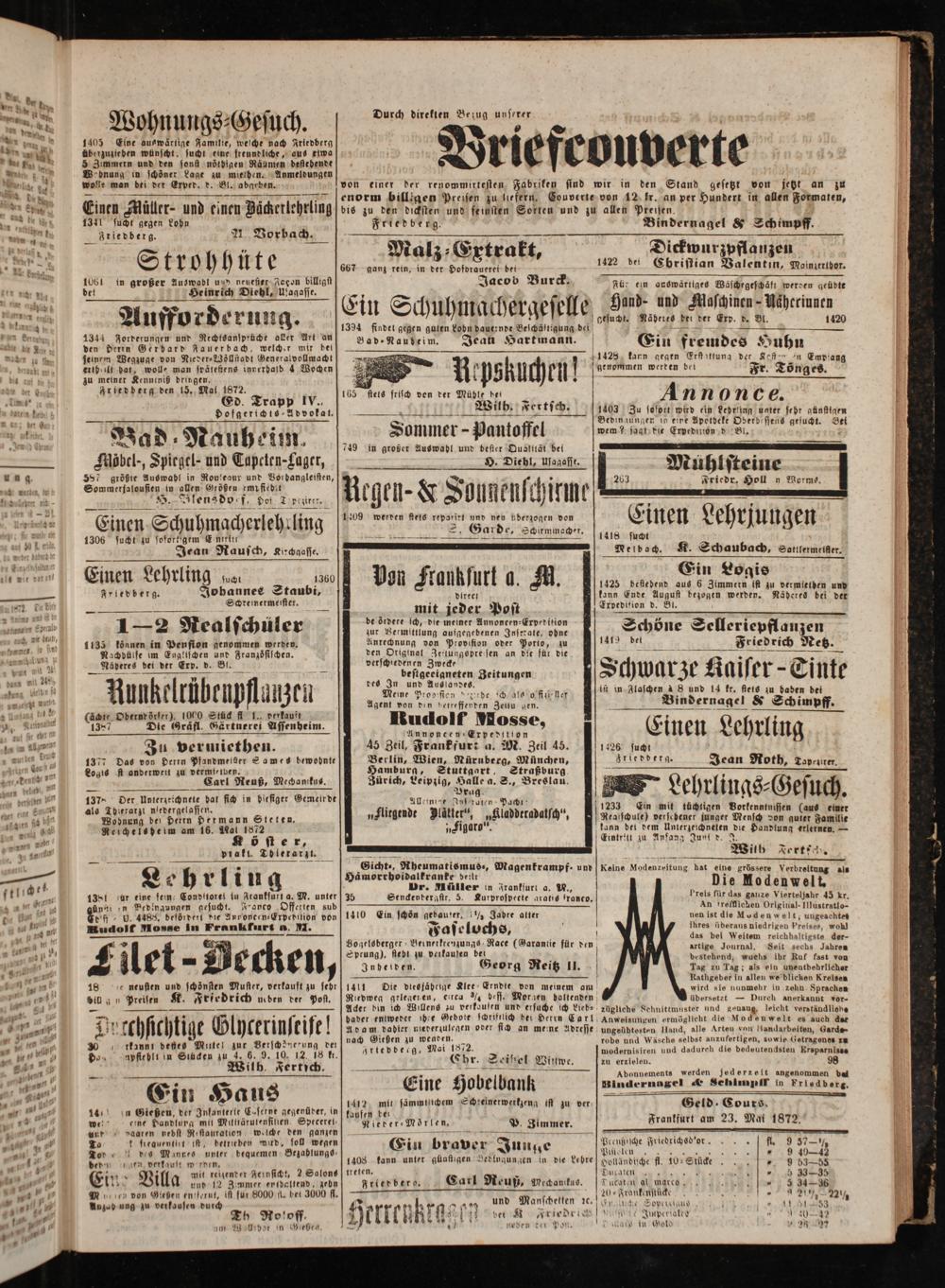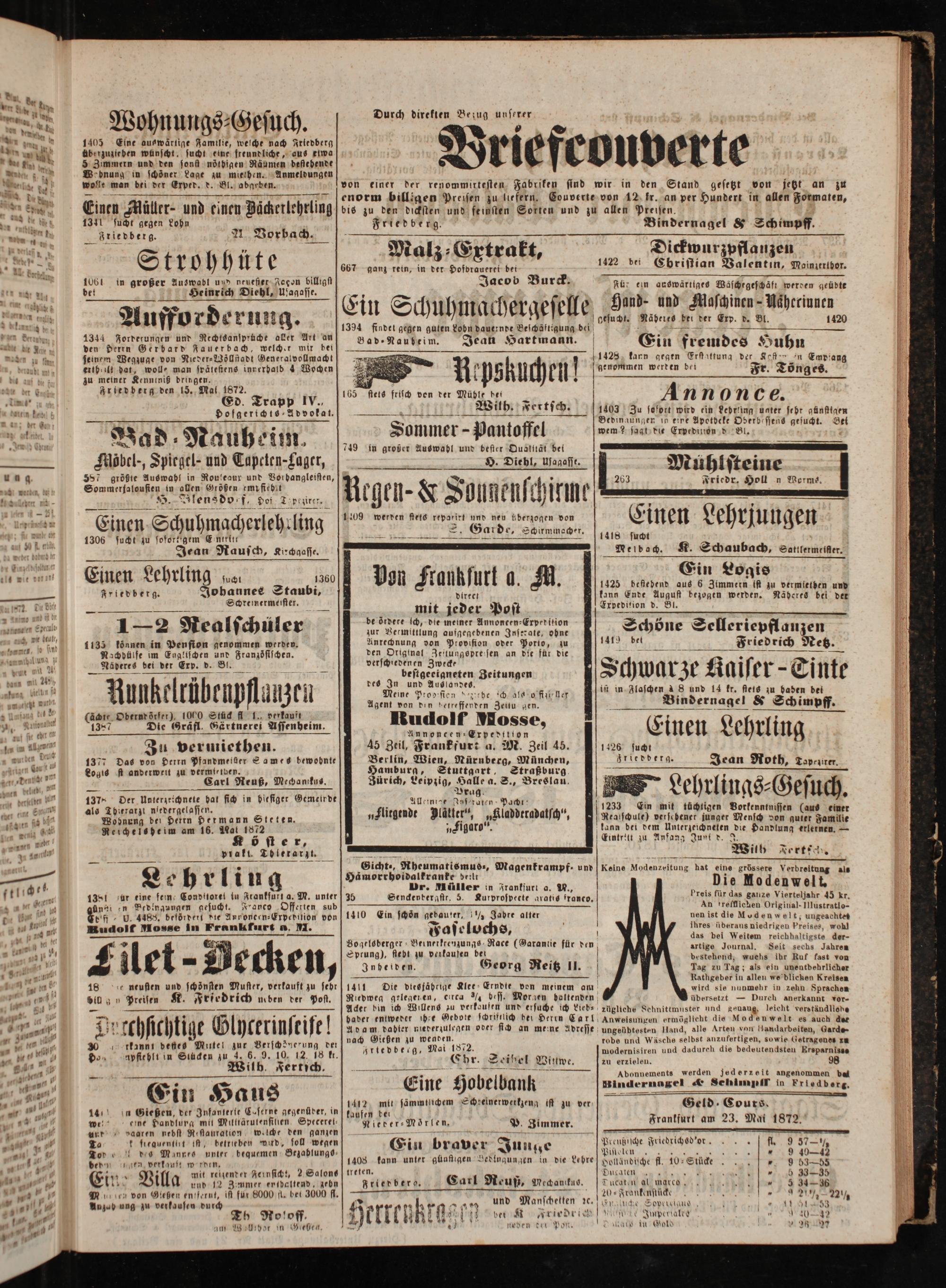 Wach f N We bnung in schöner Lage zu miethen. Anmeldungen eat 80 wolle man bei der Exper. d. Bl. abarben. von einer der renommirtesten Fabriken sind wir in den Stand gesetzt von jetzt an zu W enorm billigen Preisen zu liefern. Couverte von 12 kr. an per Hundert in allen alen, 1 eren Einen n Müller- und einen Dachetlehrling bis zu den dicksten und feinsten Sorten und zu allen Preisen. l 1341 sucht gegen Lohn riedber Bindernagel& Schimpff. u anti 9. 9 n Friedberg. A Vorbach. N ade Strohhüt Malz⸗Extrakt, 3 Dickwurzpflauzen *** 1 0 0 U 1 E 667 ganz rein, in der Hofbrauerei bei ei Ebristian Valentin, Maoinzertbor. 2 8 in großer 1— 2 2. 1 Jacob Burck. Für ein auswärtiges Wäschegeschäft werden geübte t tier u. et einri iehl, Ufsagasse. 8 1 0 2* f A in S 8 elle Hand- und Klaschinen-Mäberiunen en t Aufforderung. Ein Schuhmachergese 9 Näbete 325* b. l. f 1420 A tig u e* 1394 finder gegen guten Lobn dauernde Beschaftigung dei 3 Nun Setinber 44 Forderungen und Rechtsansprüche aller Art an 8 im. Hartmann. d 1 den deren Gerbard Fauerbach, welcher mir bei Bad-Nauttim Jean 65 ö 90 Ein fremdes Huhn rn seinem Wegzuge von Nieder⸗Völlfadt Generalvollmacht 8 5 1428 kann gegen Erstattung der Kefer en Empfang undi mn ertheilt dat, wolle man spätestens innerhalb 4 Wochen 5 N. gkl Ell! 0 genommen werden det Fr. Tönges. d a d 5 zu meiner Kenniniß dringen. 8 n dn d zrtedderg den 15. Mal Ed. Trapp I 105 stets fric ven der Müble bet 5 4 NN ON Ce. 1— bes 5 Dofgerichts⸗„Advolat.. 1 With. Fertsch. 1403 Zu sofott wird ein Lehrling uater sehr günßlaen D Bedingungen in eipe Apotheke Oderbessens gesucht. Zei