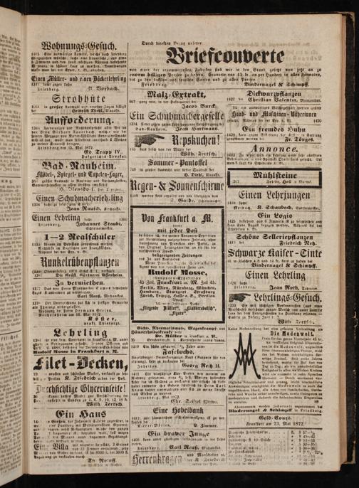 Zu vermiethen. 45 Zeil, Frankfurt a. M. Zeil 45. 126 suc 1377 Das von Herrn Pfandmeier Sames bewohnte Berlin, Wien, Nürnberg, München, Friedderg. Jean Roth, Tapezirer. Logis st anderweit zu vermt⸗tuen. Hamburg, Stuttgart Straßburg— 9 ö Carl Reuß, Mechanikus. Jürich, Leipzig, Halle a. S., Breslan. Lel jrlings⸗Gesuch. 5 Prag. 5 137 Der Unterzrichnete hat sich in bie siger Gemeirde Alleinige gaseraten Pacht: ö 8 1233 Ein mit tüchtigen Vorkenntnissen(aus einer 0 Ae eng N n Steten. uklitgtnde Platter“,„Kladderadatsch“, de hee veusebener junger Mensch don guler Familie Reichelsheim am 16. Neal 1872 ucfigaro“. kann dei dem Unterzeichneten die Handlung erlernen.— K ö st e r Eintritt zu Anfang Juni d. J. * 2 2 prakt. Thletarzt.— n Wilb Fertfch. * L 7 8 da— Abfemafiemus., Magenkrampf und Reine. hat eine grössere Verbreitung ale 25*. amorrhoidalkranke dei * h* 1 11 1 Dr. Müller ein Frankfurt a. W., 5 bie Modenwelt. 13% ur eine fem, Condttorel iu Frankfurt a. M. unter 25 Sendenbergstr. 5. Kurprospecte aratis franco. als für dan gange Werte ahr 43 kr. ün sien Bedingungen gesucht. Franco Offerten sub 1 An relnlehen Original- Illustratlo- ei b. 44888, befördert die Anroncen⸗Erpebision von 1410 Ein schön gebauter, ½ Jabte alter nen ist die Modenvelt, ungeachtet — Mosse in Frankfurt n. NMI. Faselochs,. 6 ihres überaus niedrigen Preises, wohl