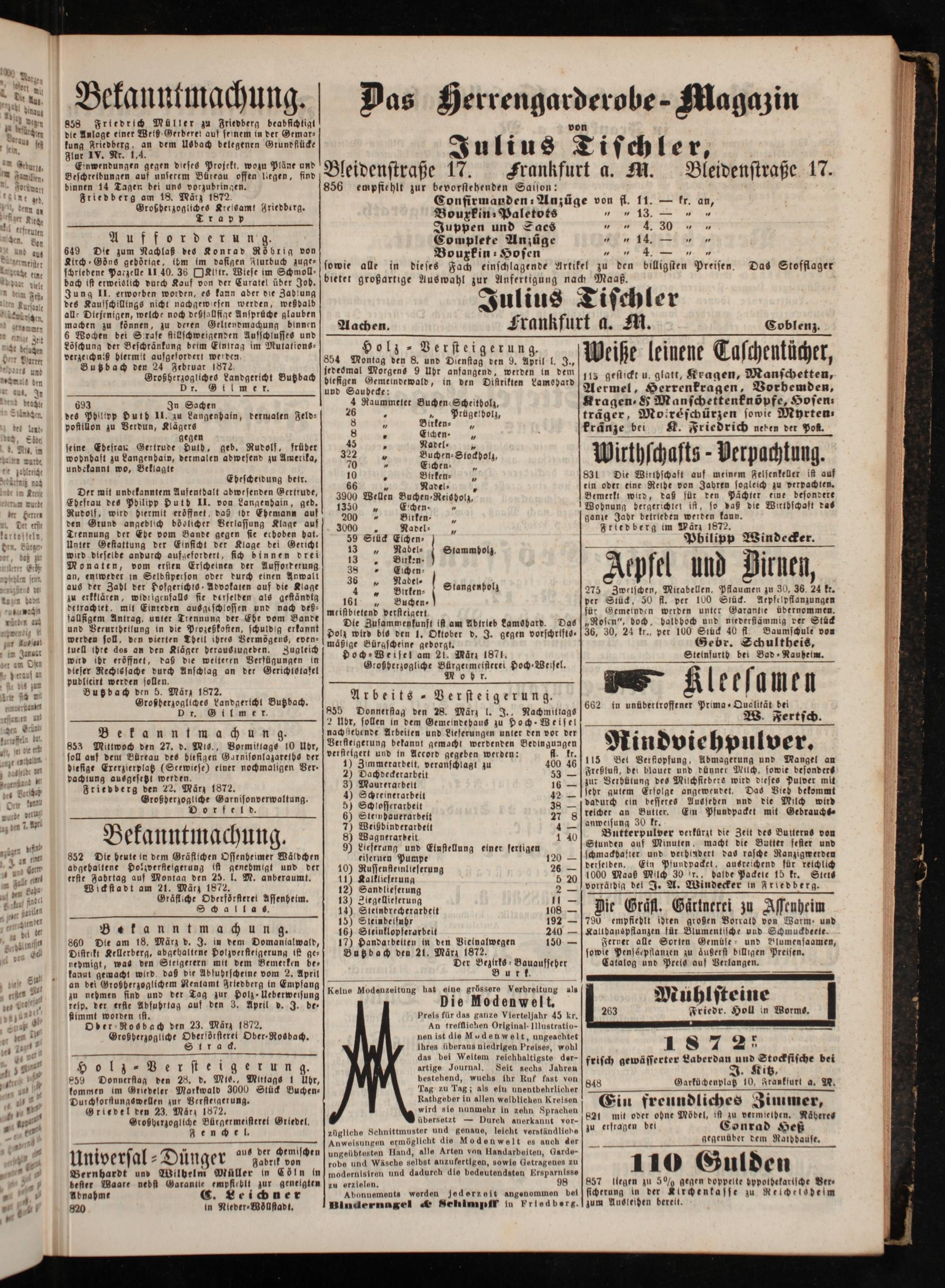 meistbletend verfteigert Die Zusammenkunft ist am Abtrieb damsbard. Das Dolz wird bis den 1. Oktober d. J. gegen vorschrifts⸗ mäßige Bürgscheine gedorgt. Doch⸗Weisel am 21. März 1871. Großherzogliche Bürgermeistetrei Hoch⸗Weisel. Mohr.