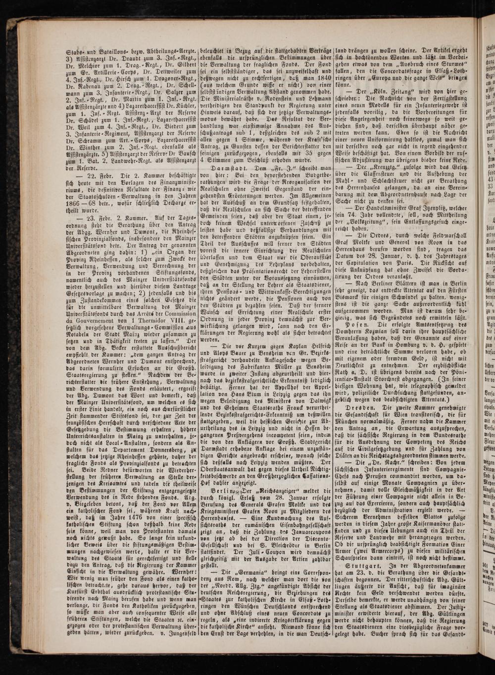 — 22. Febr. Die 2. Kammer beschäftigte sich heute mit den Vorlagen des Finanzministe- riums, die definitiven Resultate der Finanz- wie der Staatsschulden Verwaltung in den Jahren 1866— 68 betr., wofür schließlich Decharge er— theilt wurde.