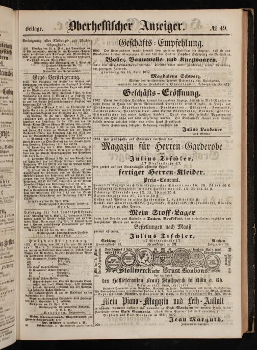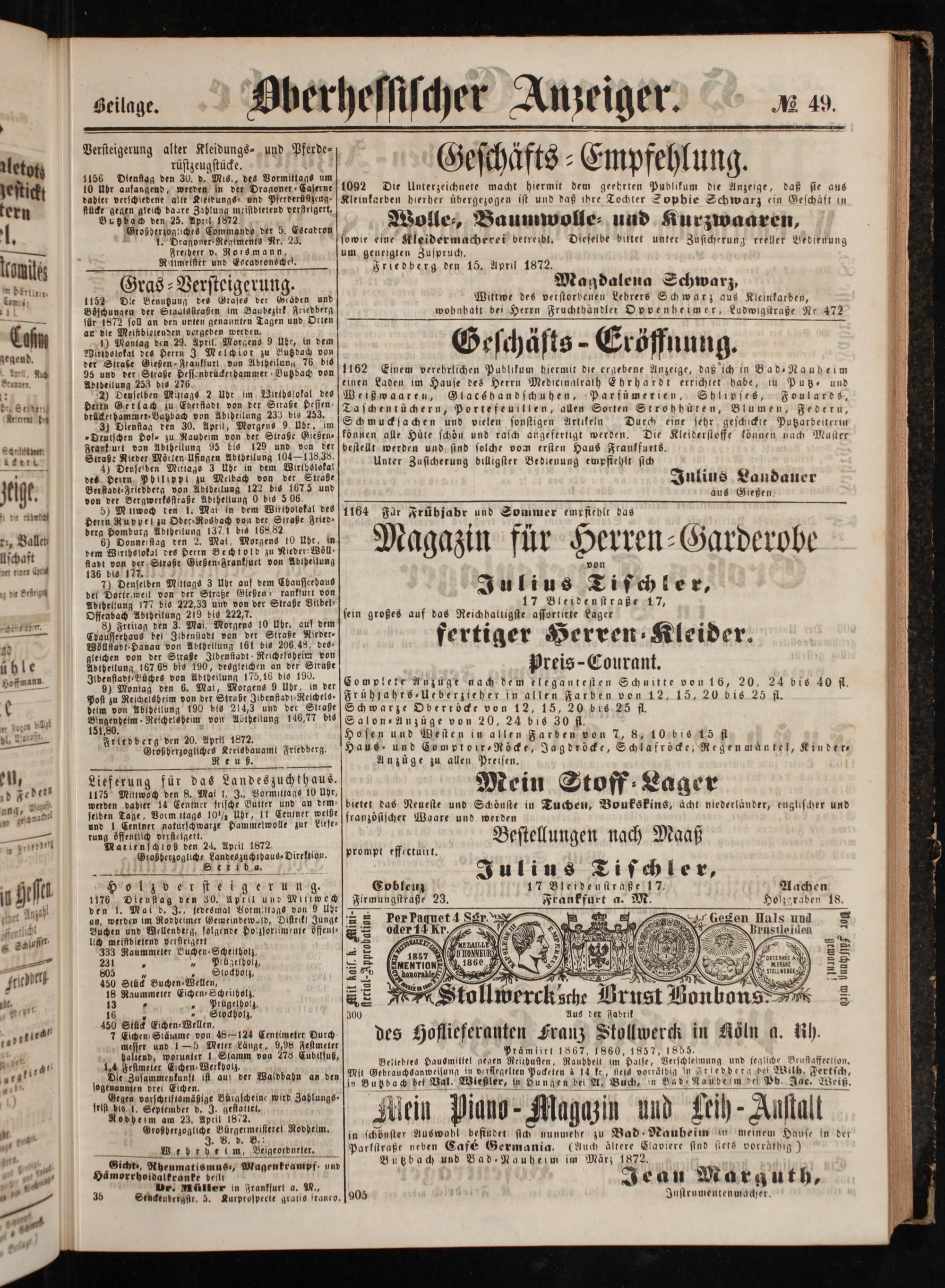sowie eine Kleidermacherei betreibt. Dieselbe bittet unter Zusicherung örreller Bedienung um geneigten Zuspruch. Friedberg den 15. April 1872. Magdalena Schwarz, Wittwe des verstorbenen Lehrers Schwarz aus Kleinkarben, wohnhaft bei Herrn Fruchthändler Oppenheimer, Ludwigstraße Nr 472