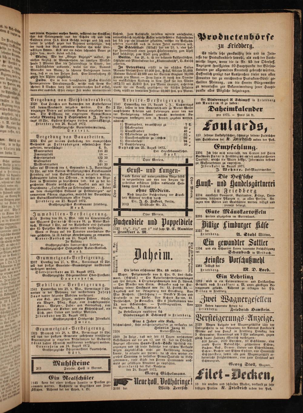 Vergebung von Weißbinderarbeit. 2328 Das Tünchen und Ausweißen der Klosterkaserne soll summisstonsweise vergeben werden. Die Be— dingungen können auf unserem Bureau eingesehen wer⸗ [den. Die Eröffnung der eingelegten Summissionen erfolgt Montag den 2 September d. J., Vormit⸗ tags 10 Ubr. Spätere Einlagen bleiben underücksich tigt. Friedberg den 26. August 1872. Großherzogliche Garnisonverwaltung. n Vergebung von Bauarbeiten. 2325 Die zur inreren Herstellung des evangelischen Bethauses zu Heldenbergen erforderlichen Bau-