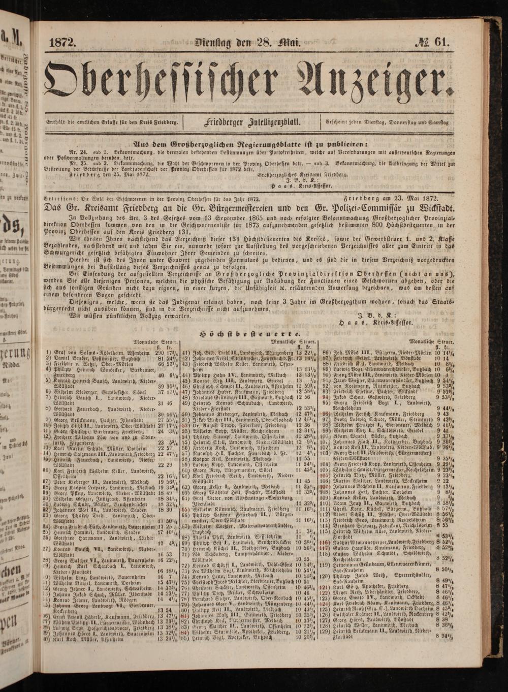 Ig Vollziehung des Art. 3 des Gesetzes vom 13 September 1865 und nach erfolgter Bekanntmachung Großherzoglicher Provinzial— direktion Oberhessen kommen von den in die Geschworenenliste für 1873 aufzunehmenden gesetzlich bestimmten 800 Höchstbesteuerten, in der Provinz Oberhessen auf den Kreis Friedberg 131.