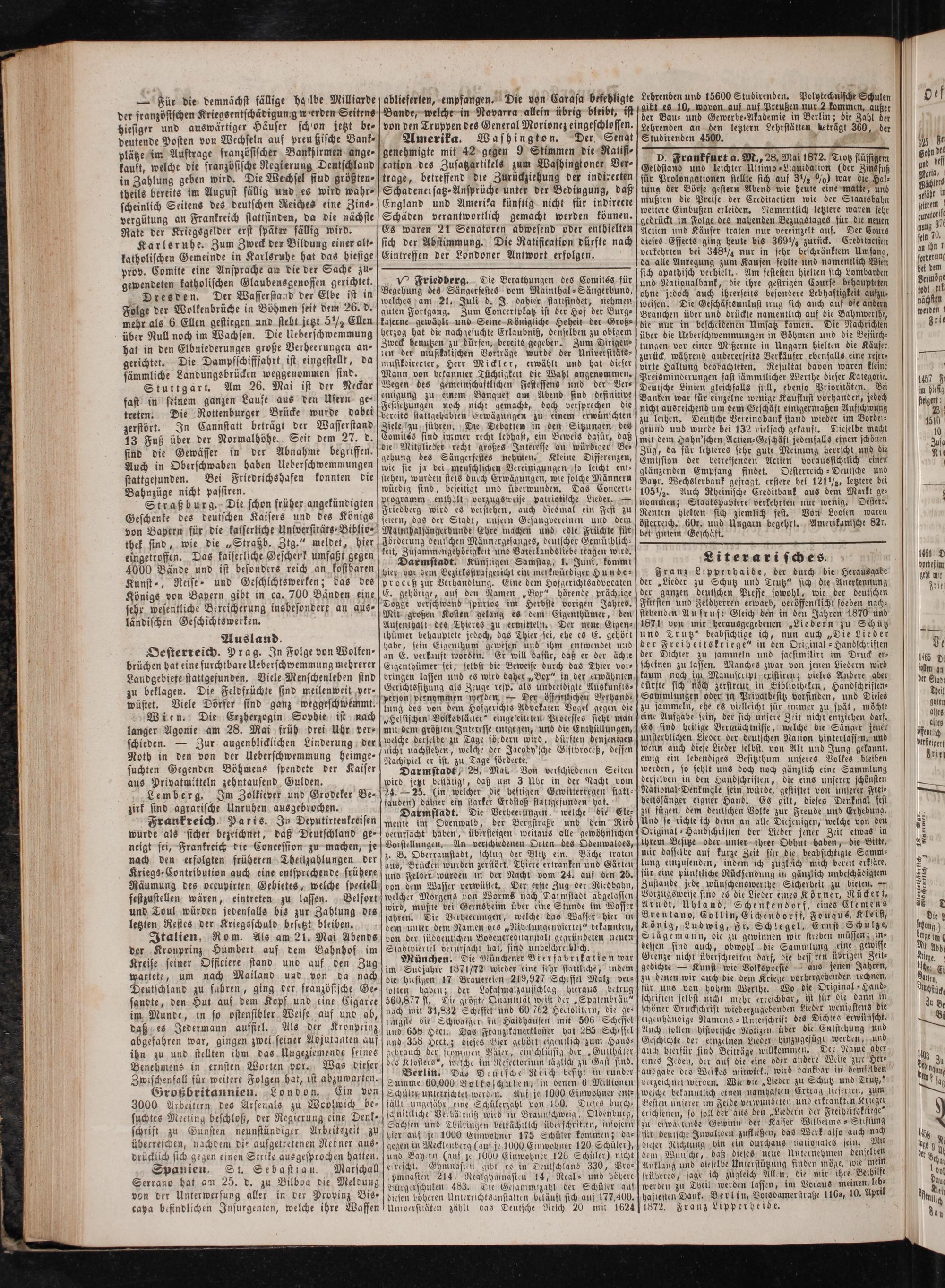 Friedberg. Die Berathungen des Comilés für Begehung des Sängerfestes vom Mainthal-Sängerbund, welches am 21, Juli d. J. dahier statifindet, nehmen guten Fortgang. Zum Concertplatz ist der Hof der Burg⸗ kaserne gewählt und Seine Königliche Hoheit der Groß— herzog hat die nachgesuchte Erlaubniß, denselben zu obigem Zweck benutzen zu dürfen, bereits gegeben. Zum Dirigen⸗ ten der musikalischen Vorträge wurde der Universitäts⸗ musikdirecter, Herr Mickler, erwählt und hat dieser Mann von bekannter Tüchtigkeit die Wahl angenommen. Wegen des gemeinschaftlichen Festessens und der Ver⸗ einigung zu einem Banquet am Abend find definitive Festsetzungen noch nicht gemacht, doch versprechen die bereits stattgehabten Erwägungen zu einem erwünschten Ziele zu führen. Die Debatten in den Sitzungen des Comités sind immer recht lebhaft, ein Beweis dafür, daß die Mitglieder recht großes Interesse an würdiger Be⸗ gehung des Sängerfestes nehmen. Kleine Disserenzen, wie sie ja dei menschlichen Vereinigungen so leicht ent⸗ stehen, wurden steis durch Erwägungen, wie solche Männern würdig sind, beseitigt und überwunden. Das Concert⸗ programm enthält vorzugsweise palriotische Lieder.— Friedberg wird es verstehen, auch diesmal ein Fest zu feiern, das der Stadt, unsern Gesangvereinen und dem Mainthalsängerbunde Ehre machen und edle Früchte für Förderung deulschen Männergesanges, deulscher Gemüthlich⸗ keit, Zusammengehörigkeit und Vaterlandsliebe tragen wird. Darmstadt. Künftigen Samstag, 1. Juni, komm! hier vor dem Bezirksstrafgericht ein merkwürdiger Hunde⸗ proceß zur Verhandlung. Eine dem Hofgerichtsadvocaten E. gehörige, auf den Namen„Box“ hörende prächlige Dogge verschwend spurtos im Herbste vorigen Jahres. Mit großen Kosten gelang es dem Eigenthümer, den Aufenthalt des Thieres zu ermitteln. Der neue Eigen⸗ ihümer behauptete jedoch, das Thier sei, ehe es E. gehört habe, sein Eigenthum gewesen und ihm entwendet und an E. verkauft worden. Er will dafür, daß er der ächte Eigenthümer sei, selbst die Beweise durch das Thier vor bringen lassen und es wird daher„Box“ in der erwähnten Gerichtssitzung als Zeuge resp. als unbeetdigte Auskunfts⸗ person veenommen werden.— Der öffentlichen Verhand⸗ lung des von dem Hofgerichts-Advokaten Vogel gegen die „Hessischen Volksbläuter“ eingeleiteten Processes sieht man mit dem größten Interesse entgegen, und die Enthüllungen, welche derselbe zu Tage fördern wird, dürften denjenigen nicht nachstehen, welche der Jacoby'sche Giftproceß, dessen Nachspiel er ist, zu Tage förderte. Darmstadt, 28. Mai. Von verschiedenen Seiten wird jetzt bestätigt, daß um 3 Uhr in der Nacht vom 24.— 25.(in welcher die heftigen Gewitterregen statl⸗ fanden) dahier ein starker Erdstoß stattgefunden hat. Darmstadt. Die Verheerungen, welche die Ele⸗ mente im Odenwald, der Bergstraße und dem Ried verursacht haben, übersteigen weitaus alle gewöhnlichen Vorstellungen. An verschiedenen Orten des Odenwaldes, z. B. Oberramstadt, schlug der Blitz ein. Bäche traten aus, Brücken wurden zerstört, Thiere ertranken und Gärten und Felder wurden in der Nacht vom 24. auf den 25. von dem Wasser verwüstet, Der erste Zug der Riedbahn, welcher Morgens von Worms nach Darmstadt abgelassen wird, mußte bei Gernsheim über eine Stunde im Wasser jahren. Die Verheerungen, welche das Wasser hier in dem unter dem Namen des„Nibelungenviertel“ bekannten, von der süddeutschen Bodencreditanstalt gegründeten neuen Stadtviertel verursacht hat, sind unbeschreiblich. München. Die Münchener Bierfabrikatien war im Sudjahre 1872 wieder eine sehr stattliche, indem die hiesigen 17 Brauereien 219,927 Scheffel Malz ver⸗ solten haben; der Lokalmalzaufschlag hieraus betrug 560,877 fl. Die größte Quanuität weist der„Spatenbräu“ nach mit 31,832 Scheffel und 60.762 Hectolitern, die ge⸗ ingste die Schwafger in Haidhausen mit 506 Scheffel und 658 Hecl. Das Franzikanerkloster hat 285 Scheffel und 338 Hect. 3 dieses Bier gehört eigentlich zum Haus⸗ gebrauch der flommen Väter, einschlüssig der„Gulthäler des Klosters“, welche im Resectorium läglich zu Gast sind. Berlin. Das Deutsche Reich besitz! in runder Summe 60,000 Volksschulen, in denen 6 Millionen Schüler unterrichtet werden. Auf je 1000 Einwohner ent⸗ jälll ungefähr eine Schülerzahl von 150. Dieses ducch⸗ schnitiliche Verhärtuiß wird in Braunschweig, Oldenburg, Sachsen und Thüringen beträchiltch überschritten, insofern hier auf je 1000 Einwohner 175 Schüler kommen; da⸗ gegen in Meckleuverg(auf je 1000 Einwohner 120 Schüler), und Bayern(auf je 1000 Einwohner 126 Schüler) nicht erreicht. Gymnasien gibt es in Deulschland 330, Pro— ymnasien 214, Realgymnasien 14, Real- und höhere Buürgerschulen 483. Die Gesammszahl der Schüler auf