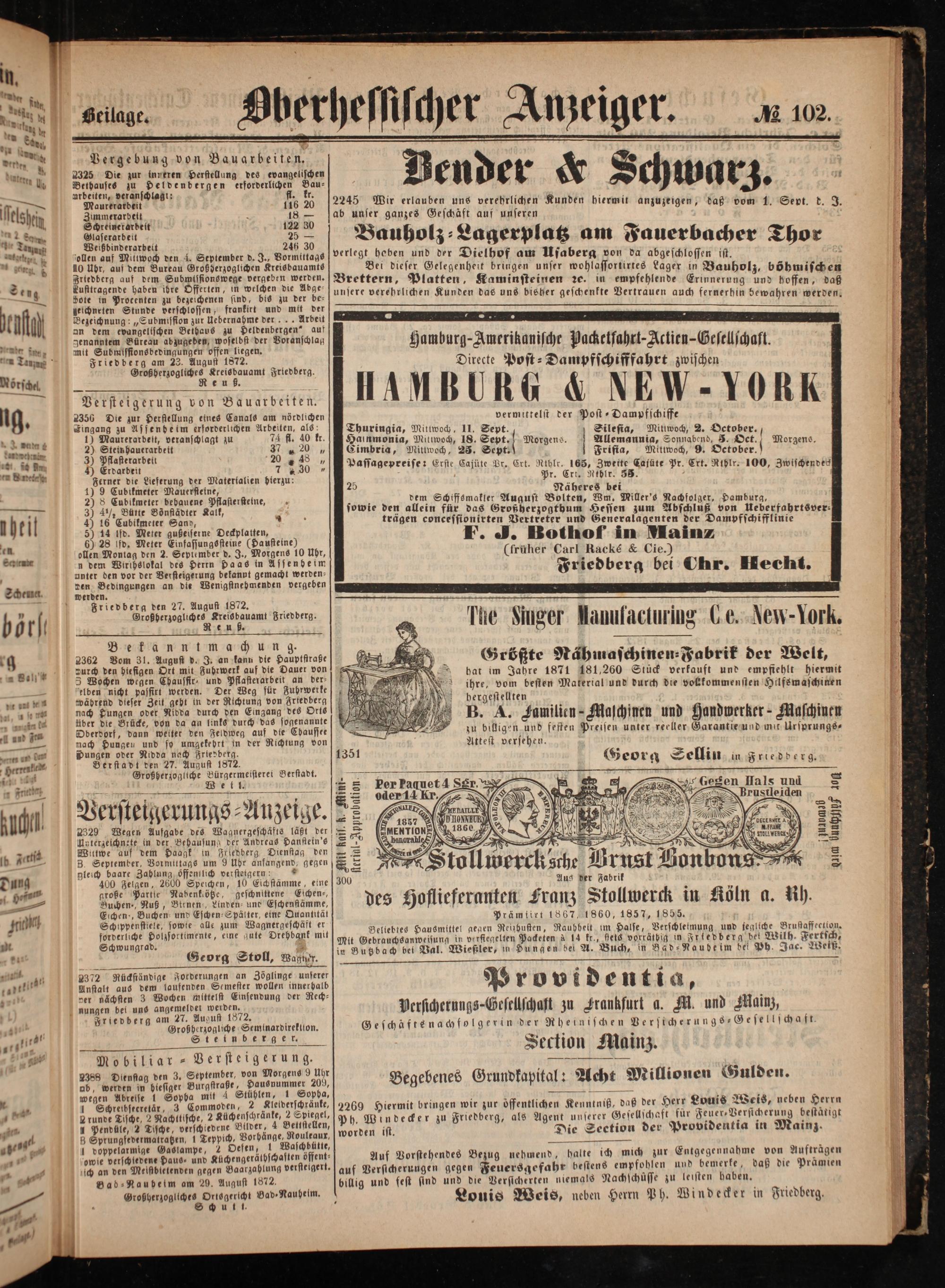 2269 Hiermit bringen wir zur offentlichen Kenntniß, daß der Herr Louis Weis, neben Herrn Ph. Windecker zu Friedberg, als Agent unserer Gesellschaft fur Feuer Versicherung bestätigt worden ist. Die Section der Providentia in Mainz.