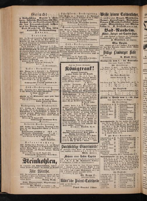 Die Flasche Extract, zu dreimal so viel Wasser, koßet in Berlin einen halben Thaler, in Fried⸗ berg bei W. Bernbeck und in Bad⸗Nau⸗ heim bei Ph. J. Weiß 1 Gulden. 2380