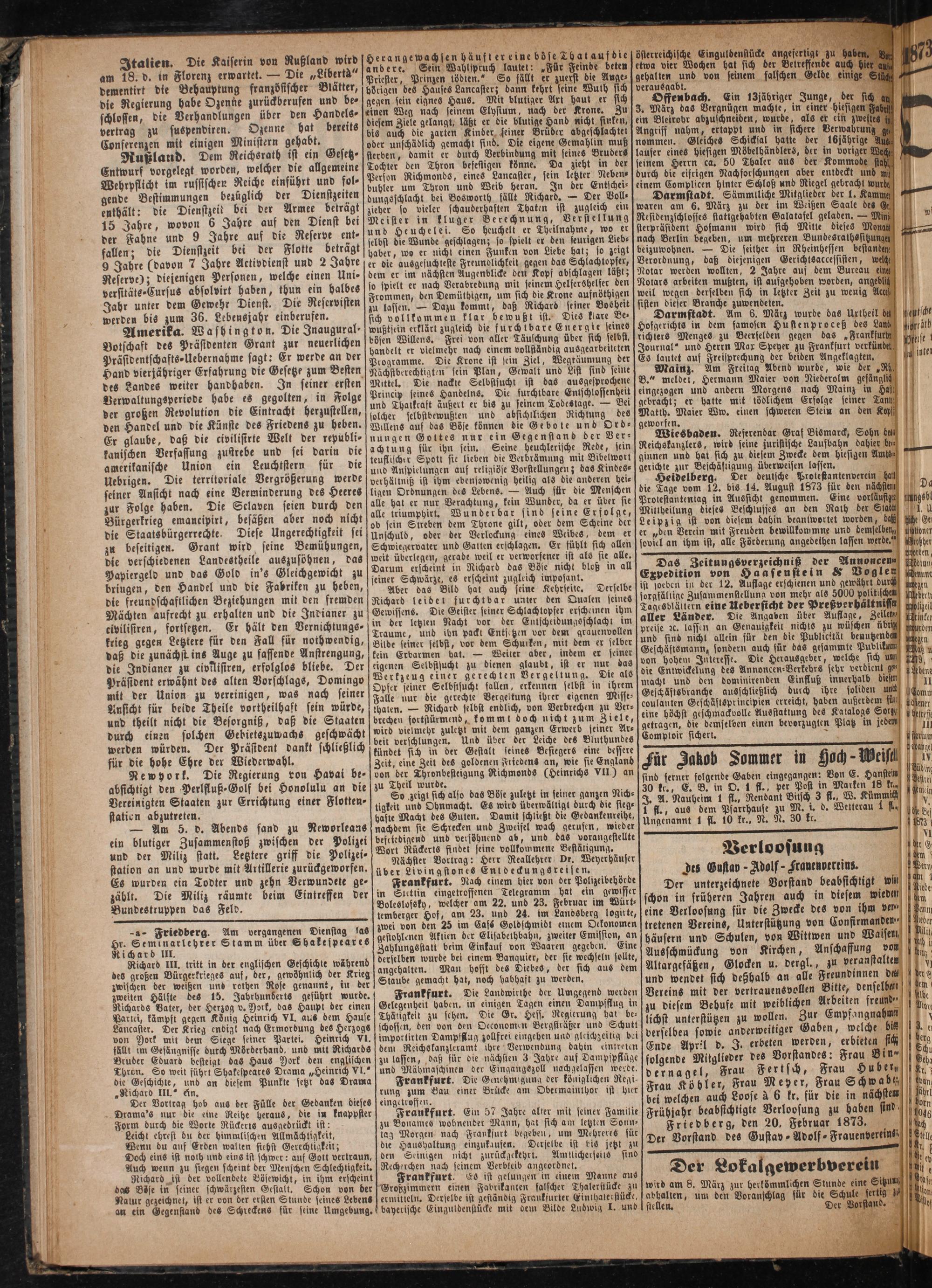 Ende April d. J. erbeten werden, erbieten sic; folgende Mitglieder des Vorstandes: Frau Bine dernagel, Frau Fertsch, Frau Huben Frau Köbler, Frau Meyer, Frau Schwabtz bei welchen auch Loose à 6 kr. für die in nächstem Frühjahr beabsichtigte Verloosung zu haben sind⸗ Friedberg, den 20. Februar 1873. Der Vorstand des Gustav-⸗ Adolf ⸗ Frauenverein