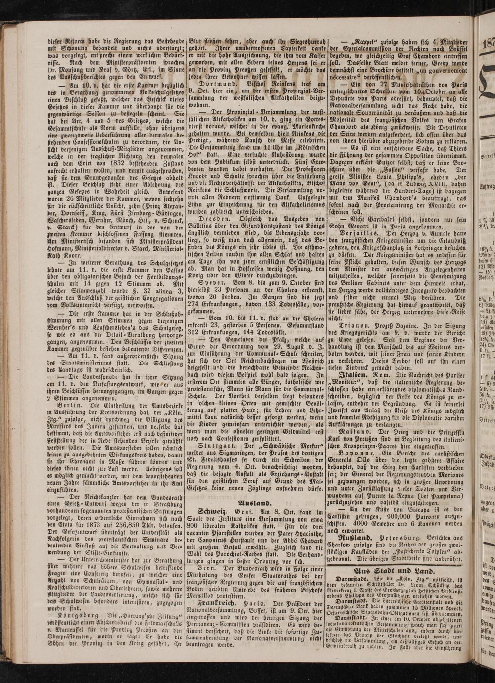 Schweiz. Genf. Am 8. Oct, fand im Saale des Instituts eine Versammlung von etwa 800 liberalen Katholiken statt. Für die drei vacanten Pfarrstellen wurden der Pater Hyacinthe, der Canonicus Hurstault und der Abbé Chavard mit großem Beifall erwählt. Zugleich fand die Wahl des Parochial-Rathes statt. Die Verhand- lungen gingen in bester Ordnung vor sich.
