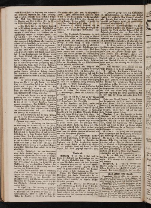 Mittheilung des Genfer Staatsrathes bei der französischen Regierung gegen die auf franzöfischem Boden geübten Umtriebe des früheren Bischofs Mermillod protestiren. Frankreich. Paris. Der Präsident der Nationalversammlung, Buffet, ist am 9. Oct. hier eingetroffen und wird der beutigen Sitzung der Permanenz Commission präsidiren. Es wird be⸗ stimmt versichert, daß die Linke die fofortige Zu⸗ sammenberufung der Nationalversammlung nicht beantragen werde.