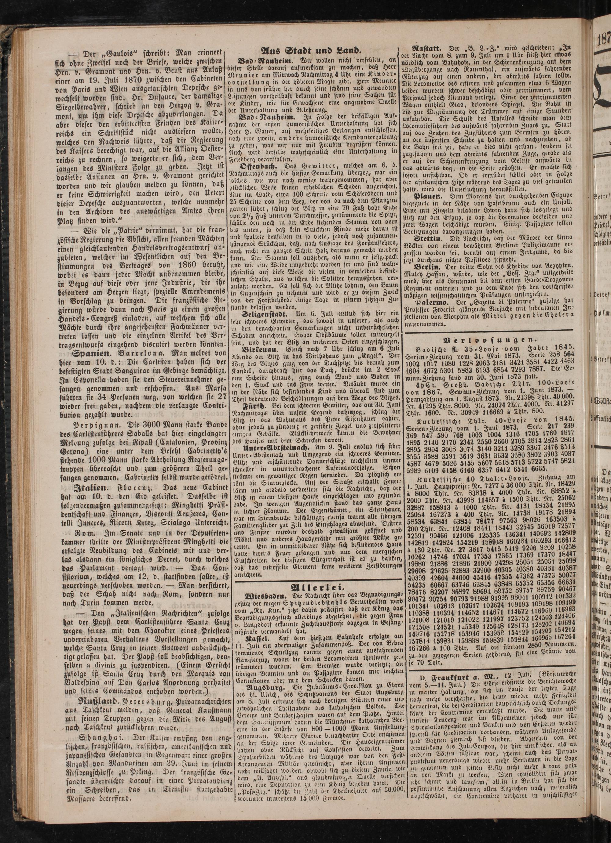 Badische fl. 35⸗Loose vom Jahre 1845. Serien⸗Ziehung vom 31. Mai 1873. Serie 258 564 1002 1017 1080 1228 2063 2181 34213581 4422 4463 4604 4672 5301 5883 6193 6854 7293 7887. Die Ge⸗ winn⸗Ziehung fand am 30. Juni 1873 statt. 5