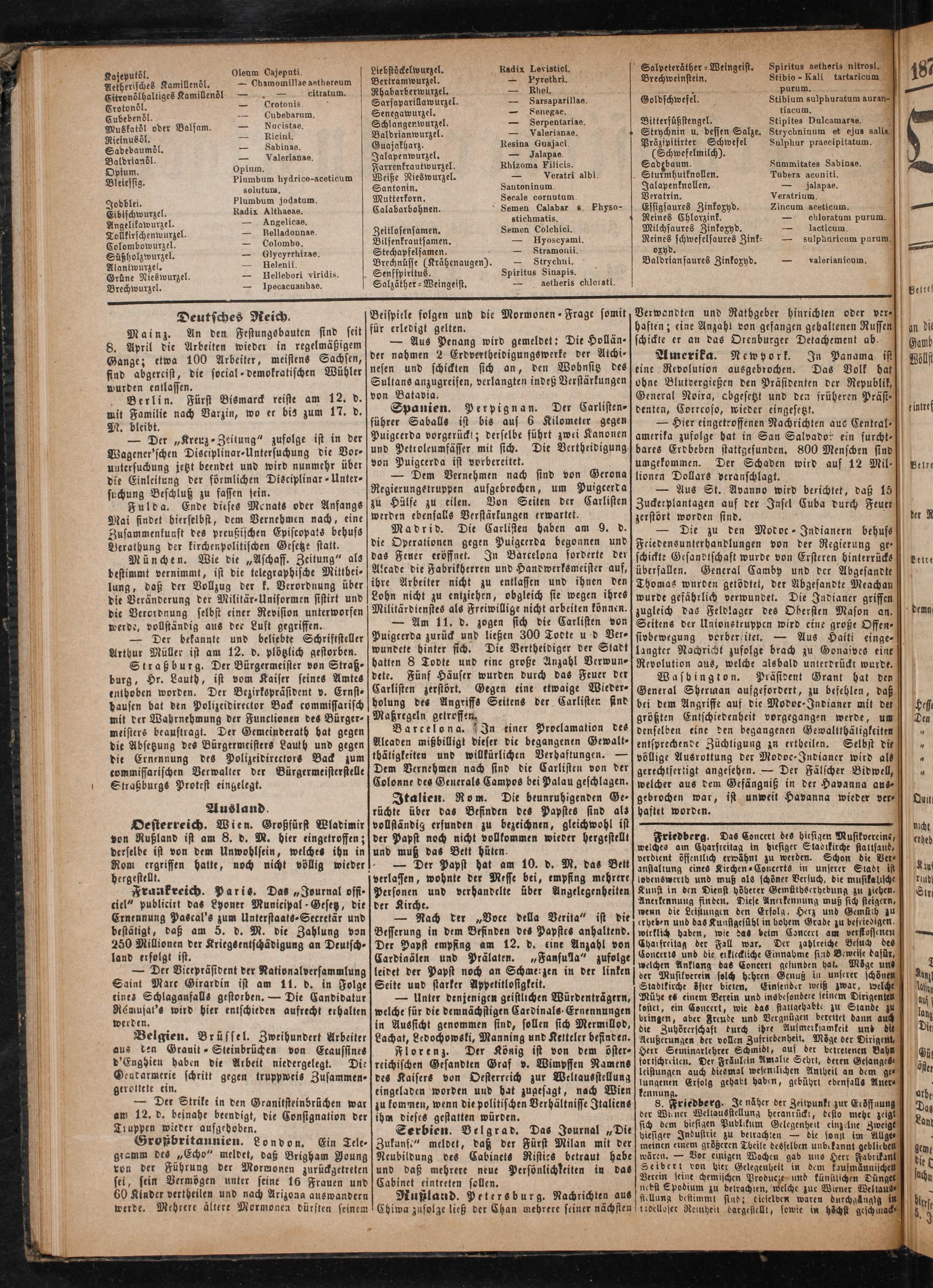 öl. Oleum OCajeputi. t Spiritus aetheris t Ae keis Kamillenöl.— Gunmen ie aethereum Bertramwurzel.— Pyrethri. Brechweinstein. 5 Stibio- Kali tartaric Eitronölhaltiges Kamillend“— eitratum. Rhabarberwurzel. Fei. 10 urum— Crotonöl.— Otcotonis. Sarsaparillawurzel. 5 Sarsaparillae. Goldschwefel. 0. Cubebenöl.— Cubebarum. Senegawurzel.— Fenegae. 5. tiacum Muskatöl oder Balsam.— Waeistae. Schlangenwurzel.— Serpentariae. Bittersüßstengel. Stipites Dulcamaras. Rieinusöl.— Rieini. Baldrianwurzel.— Valerianae. N Strychnin u. dessen Salze. Strychninum et ejus salls, Sadebaumöl.— Vadinae. Guajakharz. Resina Guajaci Präzipitirter Schwefel Sulphur praecipitatum. Baldrianöl.— Valerianae. Jalapenwurzel.— Jalapae.(Schwefelmilch). f i 1 Opium. Opium. Farrenkrautwurzel. Rhizoma Filicis. a Sadebaum. Summitates Sabinae. 7 2 Bleiessig Plumbum hydrico-aceticum Weiße Nieswurzel.— Veratri albi. Sturmhutknollen. Tubera aconiti. g . solutum. Santonin. Santoninum. Jalapenknollen.— jalapae. 1 Jodblei. Plumbum jodatum. Mutterkorn. Secale cornutum. Veratrin. n Veratrium. 1 Eibischwurzel. Radix Althaeae. Calabarbohnen. Semen Calabar s. Pbyso- Essigsaures Zinkoxyd. Zincum aceticum. 1— Angelikawurzel.— Angelicae. stichmatis. Reines Chlorzink.— chloratum purum. Tollkirschenwurzel.— Belladonnae. Zeitlosensamen. Semen Colehici. Milchsaures Zinkoxyd.— lactleum 2 Colombowurzel.— Colombo. Bilsenkrautsamen.— Hyoscyami. Reines schwefelsaures Zink:!— sulpharicum purum“. Süßholzwurzel.— Glyeyrrhizae. Stechapfelsamen..— Stramonii. oxyd. 5 1— Alantwurzel.— Helenii. Brechnüsse(Krähenaugen). 8 Strychni. Baldrian saures Zinkoxyd.— KLalerianicum. 7 Grüne Nies wurzel.— Uellebori viridis. 5 Senfspiritus. 19 5 Spiritus Sinapis. 5 5 Brechwurzel.— Ipecacuauhae. Salzäther⸗Weingeist.— acetheris chlofati. Belte Deutsches Reich. Beispiele folgen und die Mormonen Frage somit] Verwandten und Rathgeber hinrichten oder ver. Mainz. An den Festungsbauten sind seit für erledigt gelten. haften; eine Anzahl von gefangen gehaltenen Russen] an die