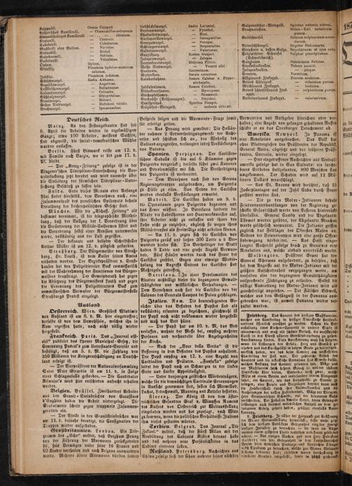 Madrid. Die Carlisten haben am 9. d. die Operationen gegen Puigcerda begonnen und das Feuer eröffnet. In Barcelona forderte der Alcade die Fabrikherren und Handwerksmeister auf, ihre Arbeiter nicht zu entlassen und ihnen den Lohn nicht zu entziehen, obgleich sie wegen ihres Militärdienstes als Freiwillige nicht arbeiten können.