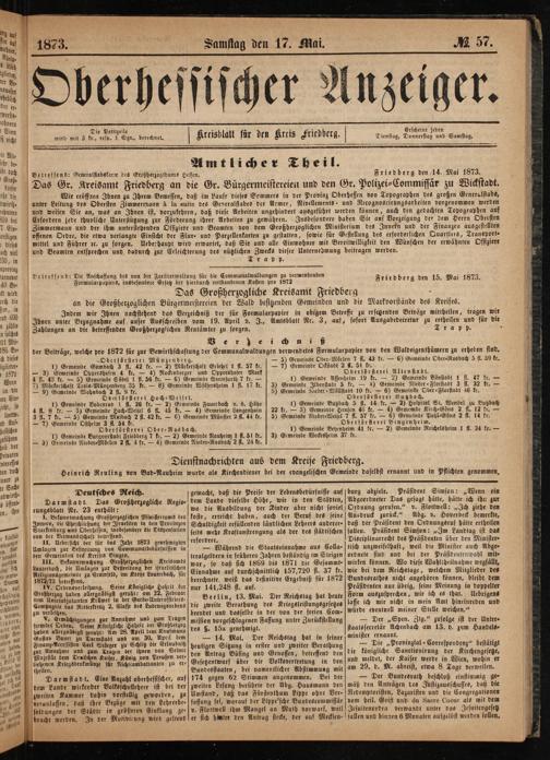 a se u 187 8 g an, 1873. Samstag den 17. Mai. . f g ö s blieb f glieder, 1 1 8 5 ner Be. 1 6 anesen 1 chibi h 1 der er ⸗ werbsz. zohnern Sinn Die Petitzeile;*;; 5 nicht wird mit 3 kr., resp. 1 Sgr., berechnet. Kreisblatt für den Krtis Friedberg. 1 it Mm. g 0 b Amtlicher Theil. * Betreffend: Generalstabskarte des Großherzogthums Hessen. diet Das Gr. Kreisamt Friedberg an die Gr. Bürgermeistereien und den Gr. Polizei-Commissär zu Wickstadt. eh die Wir eröffnen Ihnen zu Ihrem Bemessen, daß im Laufe dieses Sommers in der Provinz Oberhessen von Topographen des großen Generalstabs, dwirth,— unter Leitung des Obersten Zimmermann à la suite des Generalslabes der Armee, Nivellements- und Recognosecirungsarbeiten vorgenommen werden ebntere und weisen Sie an, was an Ihnen ist, vorzukehren, daß diese Arbeiten ungehindert ausgeführt werden können, auch den gedachten Topographen auf 509 bei Erfordern jede thunliche Unterstützung zur Förderung ihrer Arbeiten zu gewähren. 7 Ein- Zimmermann und der ihm untersteyenden Offiziere und Beamten von dem Großherzoglichen Ministerium des Innern und der Finanzen ausgestellten eigen offenen Ordre, die etwa verlangte Einsicht der Flur und Parzellenkarten zu gestatten, sowie für Gestellung des erforderlichen Quartiers, Transport- dieses mittel und Führer ꝛc. zu sorgen. Ueberhaupt wird erwartet, daß Sie und alle Einwohner mit Bereitwilligkeit den Wünschen der erwähnten Offiziere och viel und Beamten entsprechen und dadurch zur Erleichterung des nützliche 30, in Trapp. nprovin; annotern Betreffend: Die Anschaffung des von der Forstverwaltung für die Communalwaldungen zu verwendenden 40 Be- Formularpapiers, insbesondete Ersatz der hierdurch entstandenen Kosten pro 1872 kt wird — 15 an die Großherzoglichen Bürgermeistereien der Wald besitzenden Gemeinden und die Markvorstände des Kreises. bein, 8 5 Ihnen unter Bezugnahme auf unser Ausschreiben vom 19. April v. J., Amtsblatt Nr. 3, auf, sofort Ausgabedecretur zu ertheilen und für die 1 Zahlungen an die betreffenden Großherzogsichen Rentämter zu sorgen. n solches i ö 21 Nit⸗ Verzeichni ß 180 De⸗ der Beiträge, welche pro 1872 für zur Bewirthschaftung der Communalwaldungen verwendetes Formularpapier von den Waldeigenthümern zu erheben sind. 5 diesee g Oberförsterei Münzenberg. glieder ⸗ 1) Gemeinde Gambach 3 fl. 42 kr.— 2) Märkerschaft Griedel 1 fl. 57 kr. 17— 3) Gemeinde Oppershofen 4 kr.— 4) Rockenberger und Oppershofer Mark Wenn 4 fl. 43 kr.— 5) Gemeinde Södel 1 fl. 56 kr.— 6) Gemeinde Steinsurth 7 kr.— ,) Märkerschaft Trais⸗Münzenberg 35 kr.— 8) Gemeinde Wölfersheim 1 fl. 17 kr. an die— 9) Gemeinde Wohnbach 2 fl. 9 kr. on Ein⸗ Ober försterei Hoch⸗Weisel. lebt, so 1) Gemeinde Bodenrod 1 fl. 26 kr.— 2) Gemeinde Fauer bach v. d. Höhe ö 1 110 4 fl. 8 kr.— 3) Gemeinde Hoch⸗Weisel 6 fl. 45 kr.— 4) Gemeinde Langenhain and. 3 fl. 7 kr.— 5) Gemeinde Maibach 2 fl. 42 kr.— 6) Gemeinde Münster 2 fl. 44 kr. d Auf.— 7) Gemeinde Ostheim 3 fl. 54 kr. hessischen Oberförsterei Ober⸗Ros bach. führen 1) Gemeinde Burgvorstadt Friedberg 7 kr.— 2) Gemeinde Nauheim 1 fl. 51 kr. 3) Gemeinde Weckesheim 37 kr. 10 3) Gemeinde Nieder⸗Mörlen 2 fl. 4 kr.— 4) Gemeinde Nieder⸗Rosbach 2 fl. 24 kr. heil dern privaten 7. nleresse Dienstnachrichten aus ten doch Heinrich Reuling von Bad⸗Nauheim wurde als Kirchendiener bei der evangelischen Gemeinde daselbst ernannt und in Pflichten genommen. unter zu tt Sache 1 b 5 3 adwirth⸗ Deutsches Reich. gemacht, daß die Preise der Lebensbedürfnisse auf b öfen 0 Darmstadt. Das Großherzogliche Regie- dem Lande dieselbe Höhe, wie in den Städten, in, iht tungsblatt Nr. 23 enthält: wo die Ausbildung der Kinder aber nicht soviel l I. Bekanntmachung Großherzoglichen Ministeriums des koste, erreicht haben, auch der Beruf des seine Da 1 Kan. deen Schuldigkeit erfüllenden ländlichen Lehrers anderer- — at urg un erhessen, insbesondere die Dispensation 1 adti tek von der Verwandischaft belressenb. seits mehr Kraftanstrengung als der des städtischen nu II. Uebersicht der für das Jahr 1873 genehmigten erfordere. 5 5 5 %„ Amlagen zur 1 von Communalbebürfnissen in— Während die Staatseinnahme aus Colla- eat den Gemeinden des Kreises Bingen.. teralgeldern in früheren Jahren beständig im Steigen chen III. Bekanntmachung Großherzoglichen Kreisamts war, so daß sich 1869 bis 1871 die Gesammt⸗ gt fi. Lauterbach, die Umlagen zur Bestreitung der israelitischen Ei 0 d chnittlich 157,720 fl. 37 kr beten⸗ Religionsgemeinde zu Crainseld, im Kreise Lauterbach, für innahme auf durchschnittlich 70 ft. 8 Sturm 1872/3 betreffend. berechnete, weist das definitive Ergebniß für 1872 zen auf 8 5 eee 1 ee der nur 141,248 fl. auf. Saängig roßherzog haben allergnäbigst geruht: am 22. Februar 4 g g 1— dem een Krämer in der Garde⸗Unterofficiers-- Berlin, 13. Mai. Der Reichstag hat heute Compagnie bas Ritterkteuz 2. Classe des Ludewigsordens die zweite Berathung des Kriegsleistungsgesetzes