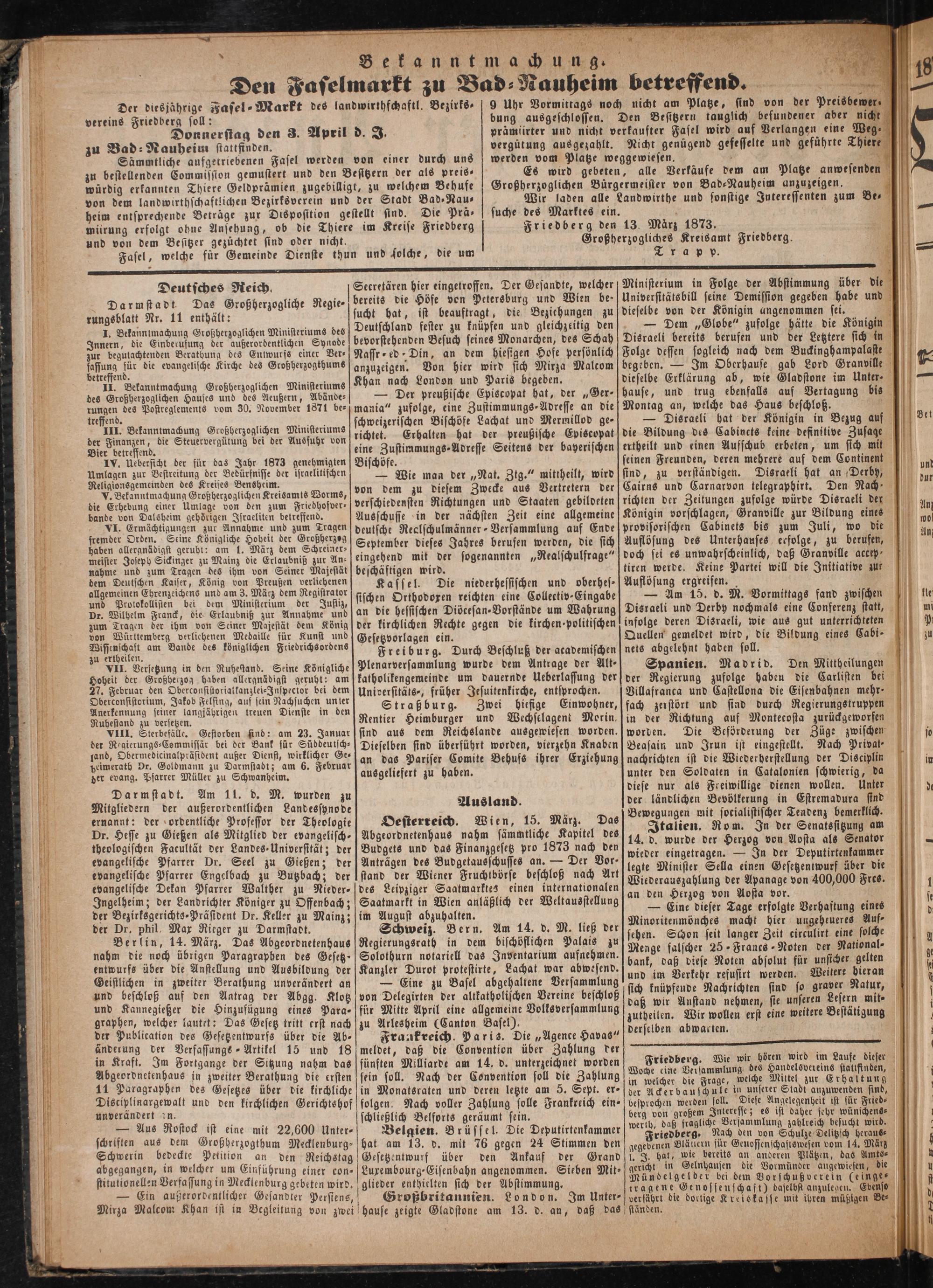 Oesterreich. Wien, 15. März. Das Abgeordnetenhaus nahm sämmtliche Kapitel des Budgets und das Finanzgesetz pro 1873 nach den Anträgen des Budgetausschusses an.— Der Vor ⸗ stand der Wiener Fruchtbörse beschloß nach Art des Leipziger Saatmarktes einen internationalen Saatmarkt in Wien anläßlich der Weltausstellung im August abzuhalten.